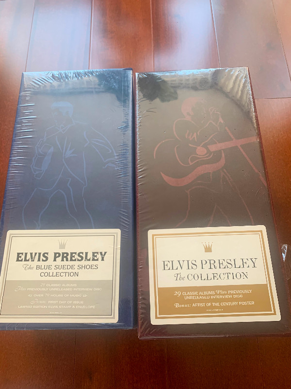 The Ultimate Elvis Collector very RARE box sets. The Blue Suede Shoe Collection. Over 29 hours of music. The Red Suede collection containing 30 CD’s. Sealed with one having a slight tear in the cellophane seal, but the actual box sets are in mint shape. Both are in suede style packaging and not easy to find. But they are available here at these low prices. $300.00 each one or buy both for $500.00 Pick up only.