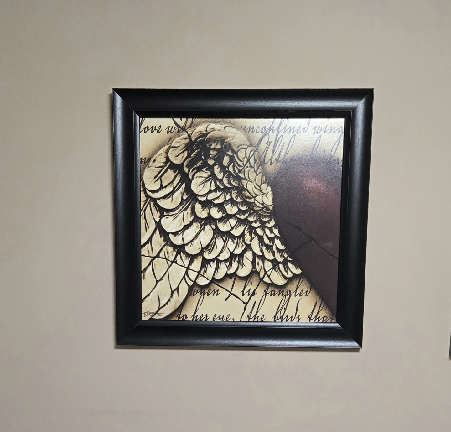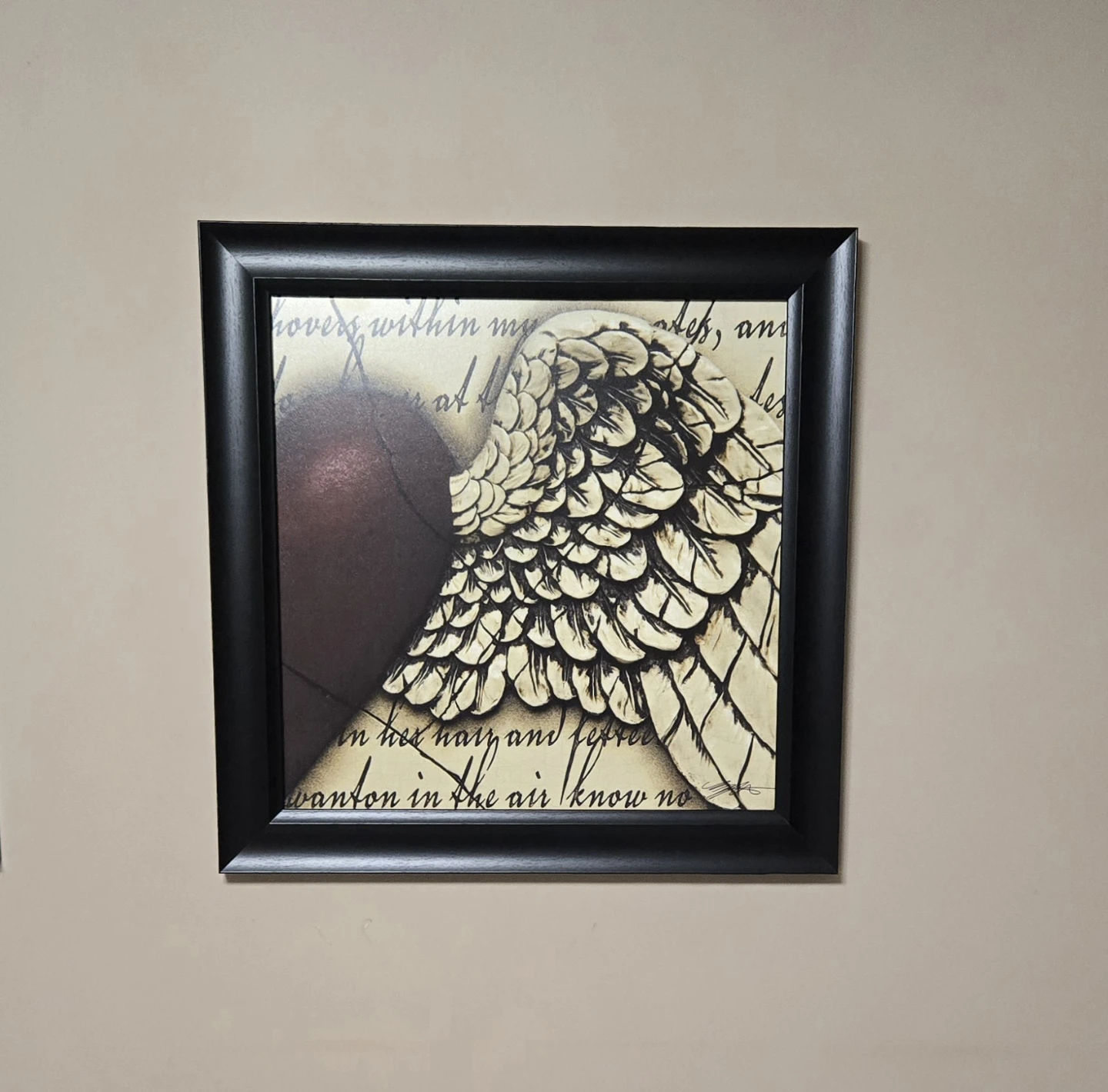 Like new. Set of two framed canvas prints of angel wings with a heart shape formed where the two prints meet. Frame is black. Each picture measures 24.5". Cross-posted.