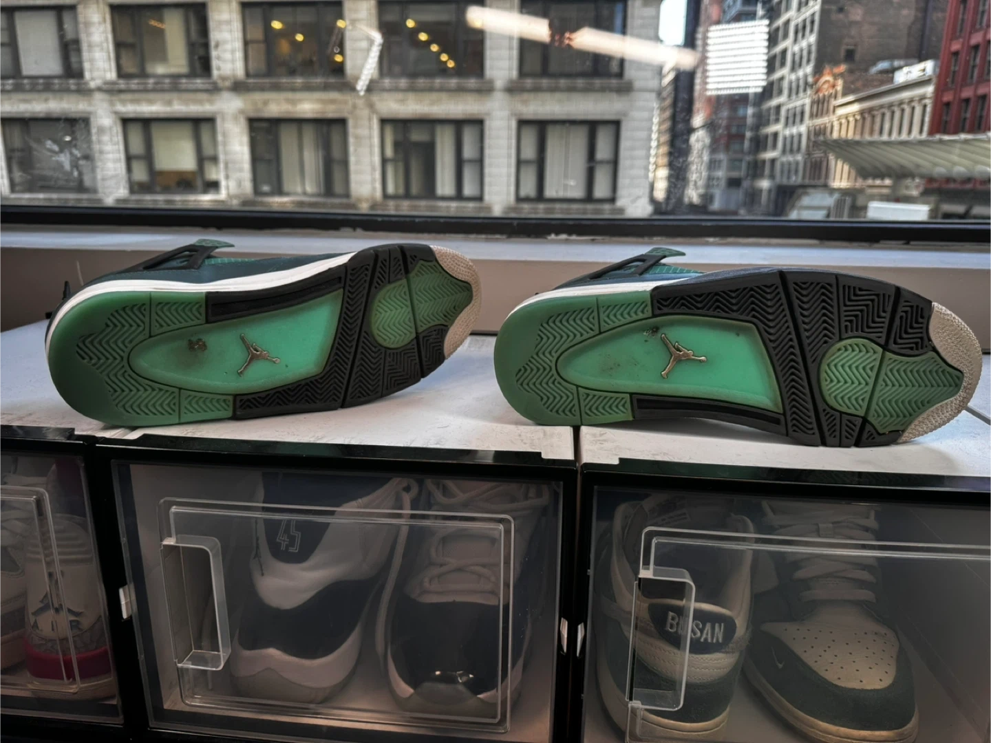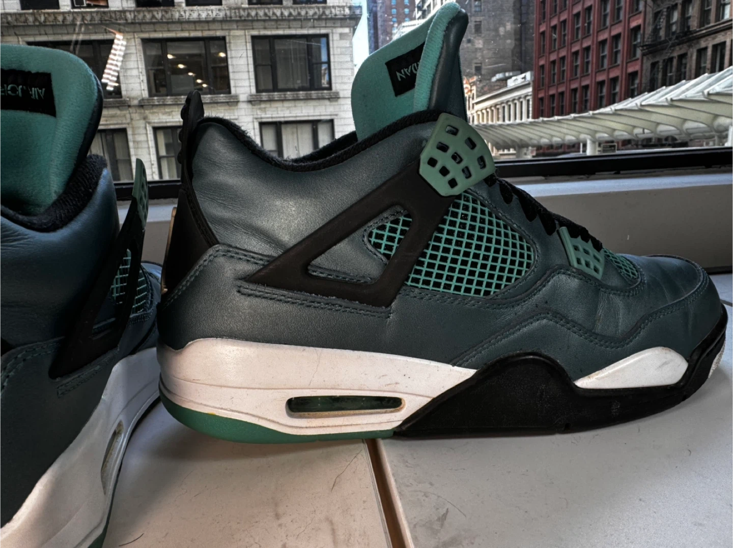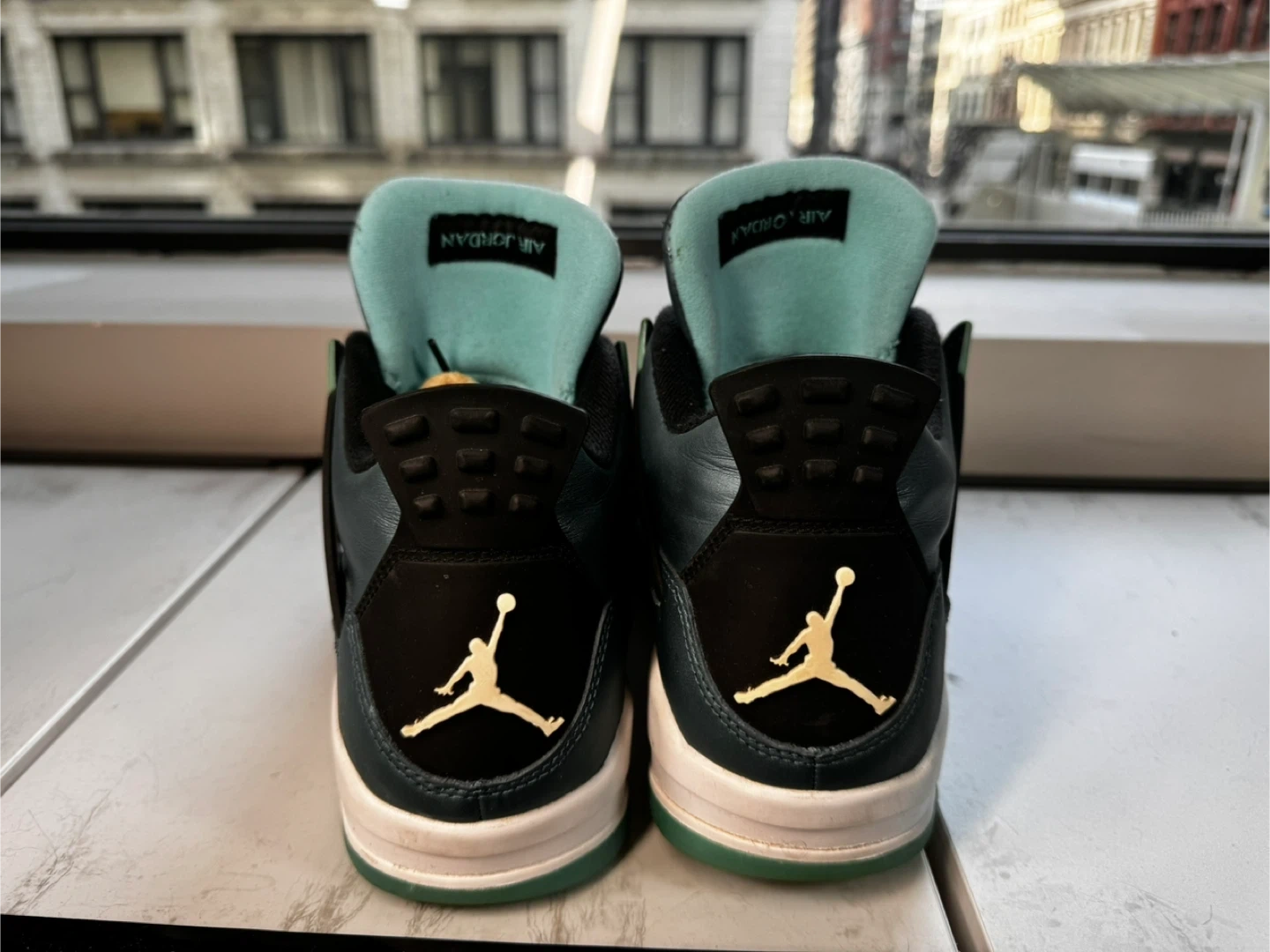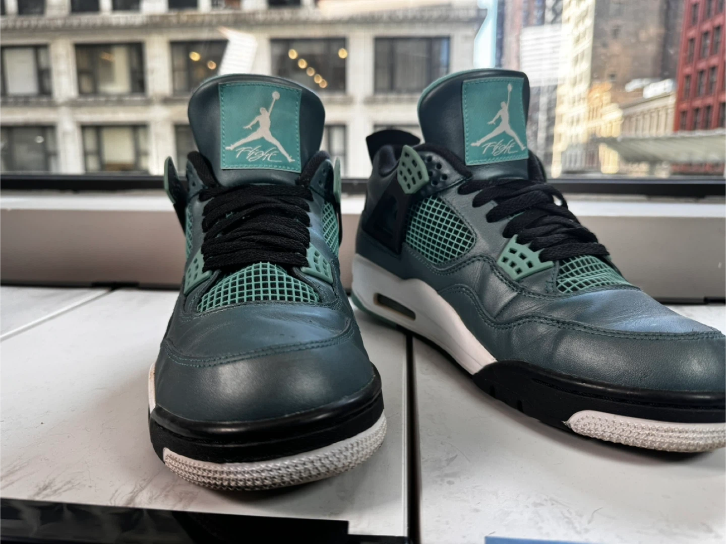 15Selling a pair of Air Jordan 4 Retro in a teal colorway. They're in good condition with some signs of wear, as shown in the pictures. Lost the hang tag and no box.