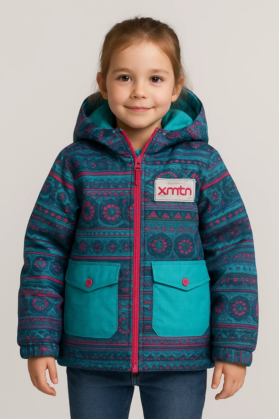 A cute and colourful winter jacket for kids! The jacket features a fun pattern with teal and pink accents. It has a hood and two front pockets. Perfect for keeping your little one warm and stylish during the colder months!