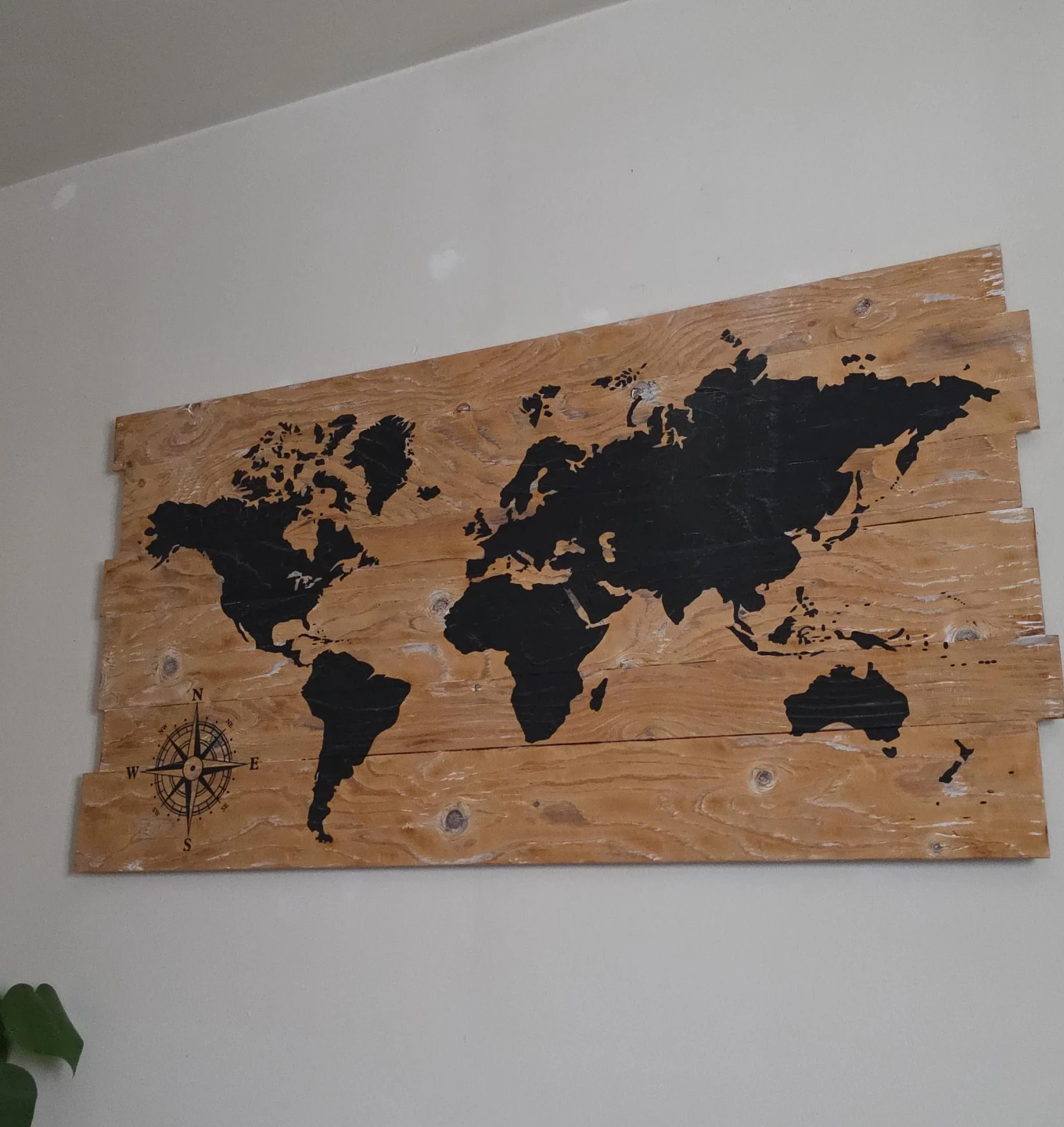 Selling a charming wooden world map wall art piece! It's a unique and eye-catching decor item that would look great in any room. The map is painted in black on a light-coloured wooden background. It adds a rustic and adventurous touch to your home