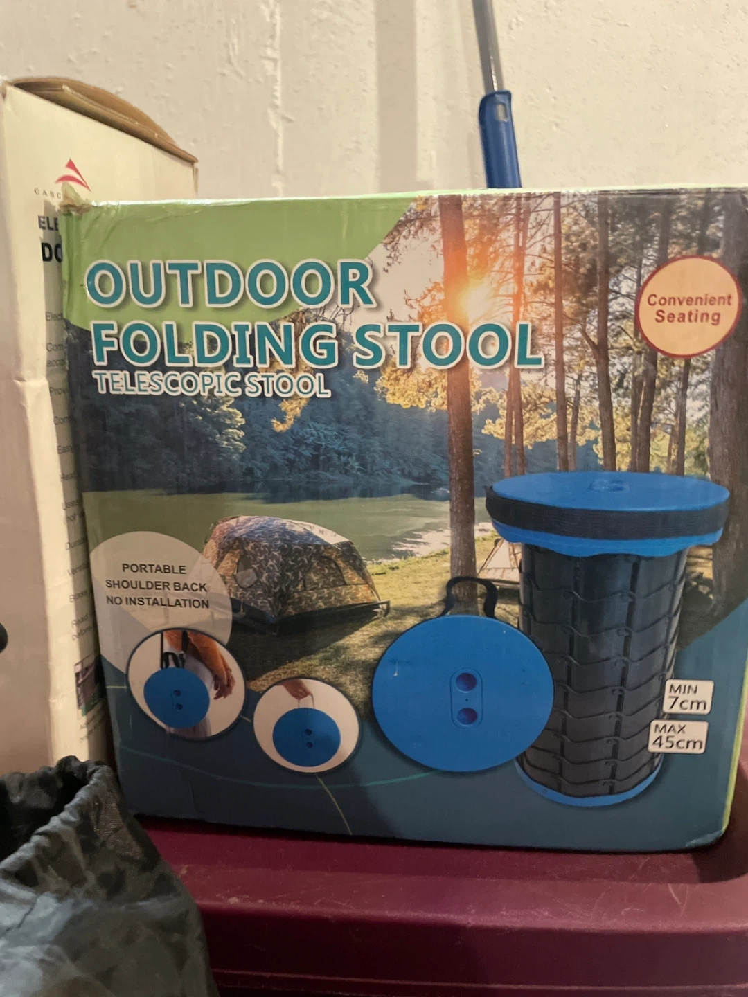 Selling a Cascade Sport Double Mantle Lantern with electronic ignition, providing up to 400 candle power illumination. It has a control knob for adjusting light intensity and uses 14.1 or 16.4 oz propane cylinders (not included). Also included is a Coleman Rest & Relax Queen air mattress. Outdoor folding stool.