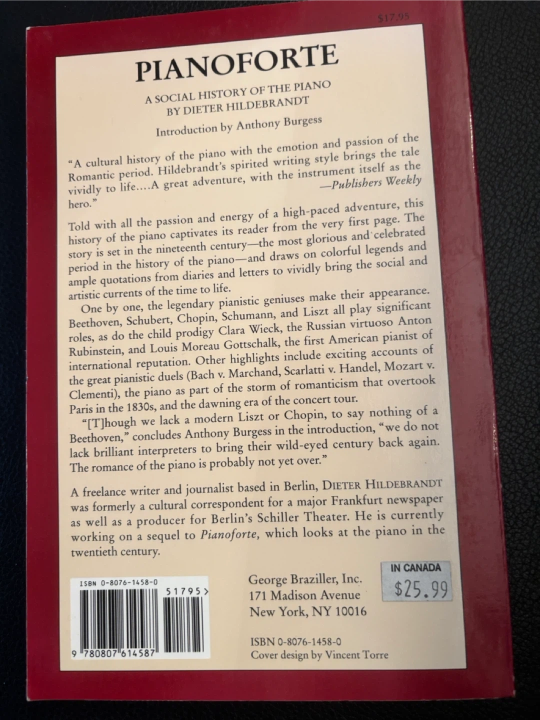 Selling "Pianoforte: A Social History of the Piano" by Dieter Hildebrandt. It provides a cultural history of the piano with the emotion and passion of the Romantic period. The book brings colourful legends and ample quotations from diaries and letters to vividly bring the social and artistic currents of the time to life. Originally sold for $25.99 in Canada.
