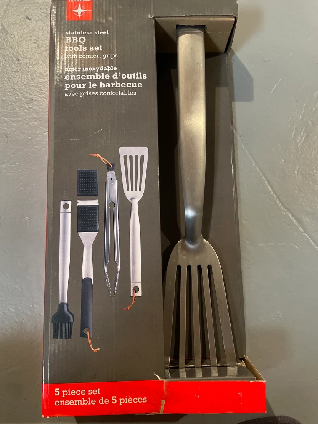 Selling a Tech Gear stainless steel BBQ tools set! This is a 5-piece set with comfort grips. It includes all the essentials for your next barbecue.
