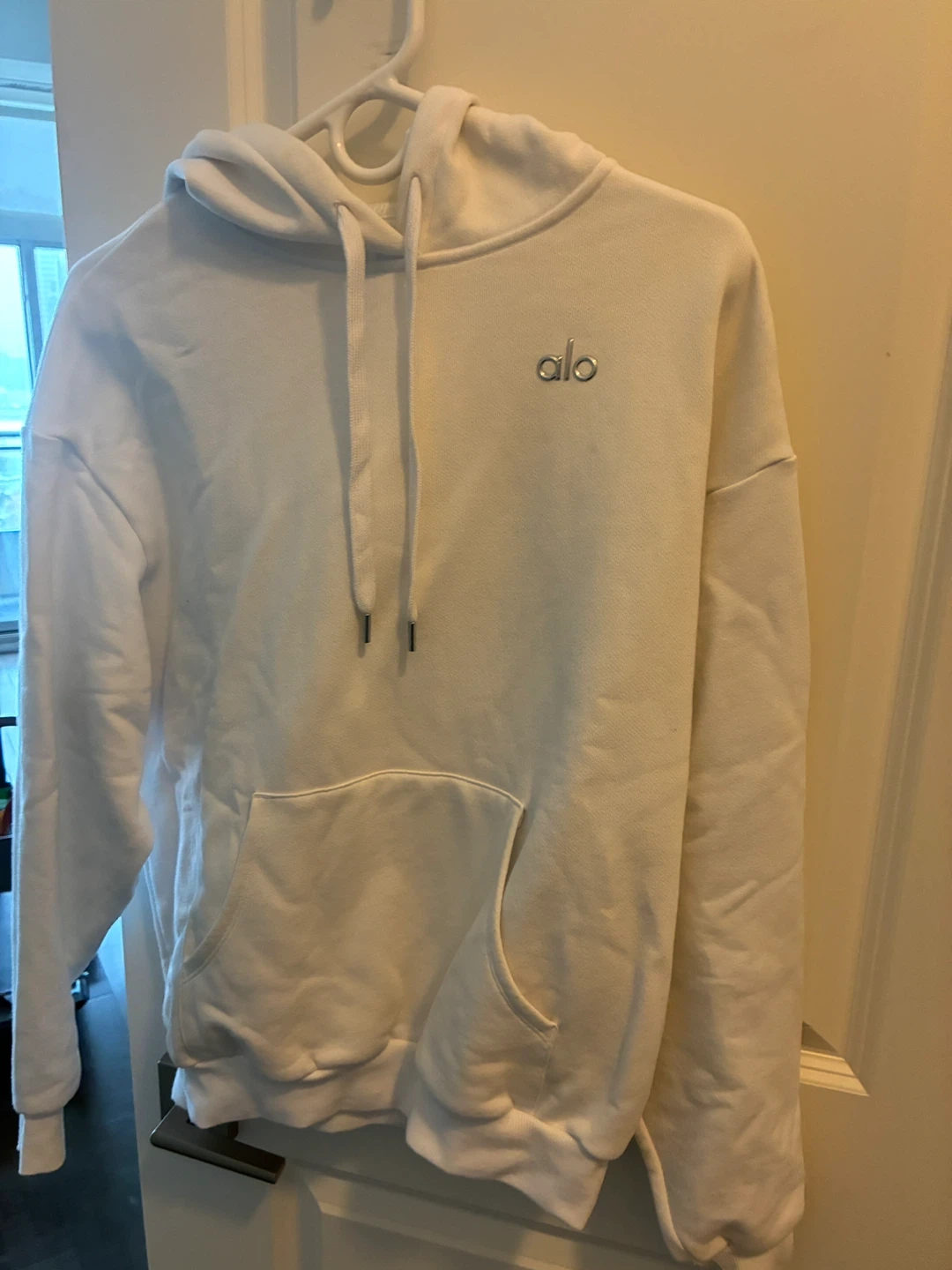 Selling a white-colored hoodie from ALO Yoga in size XS. It's in great condition and ready for a new home!
