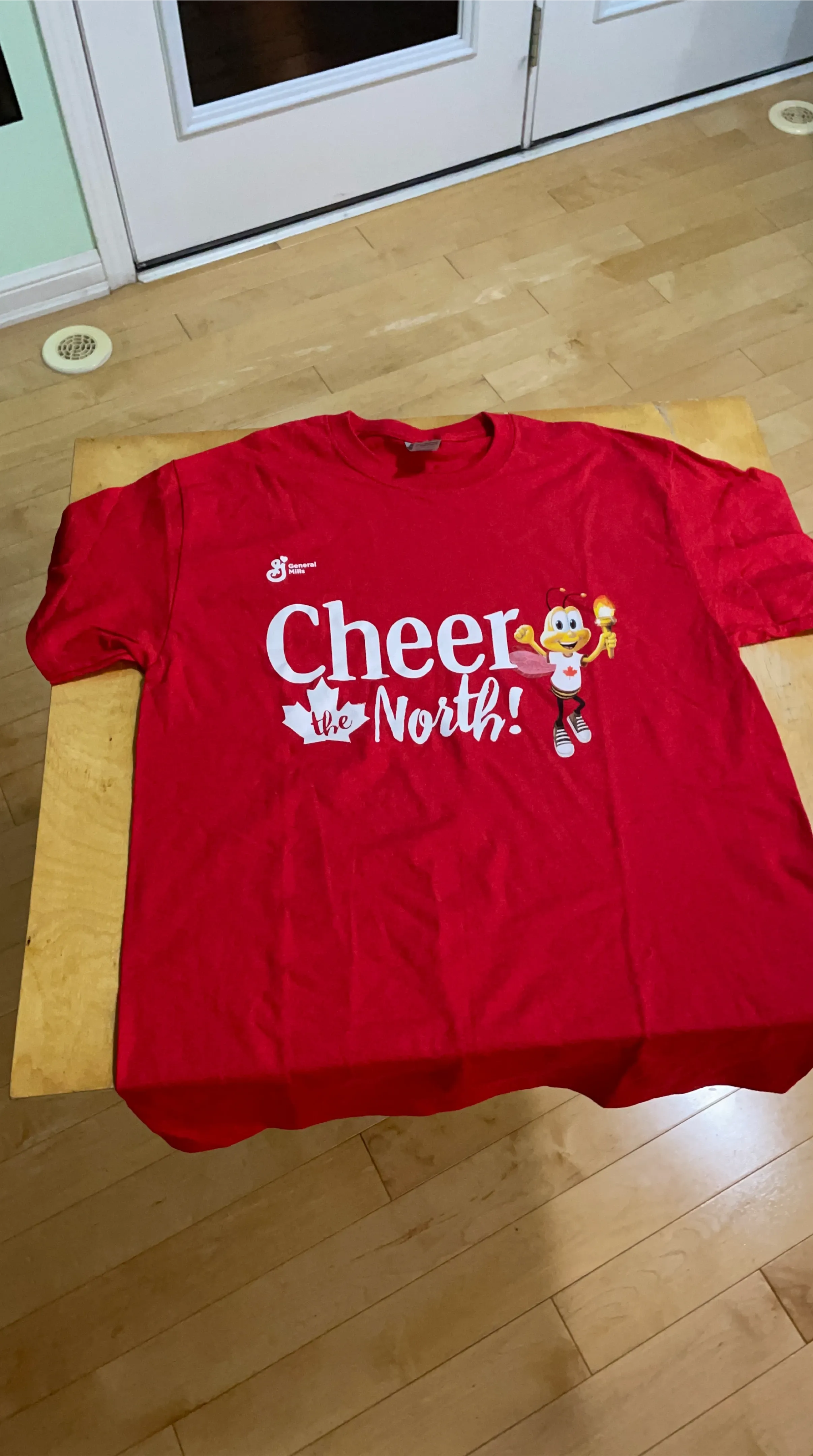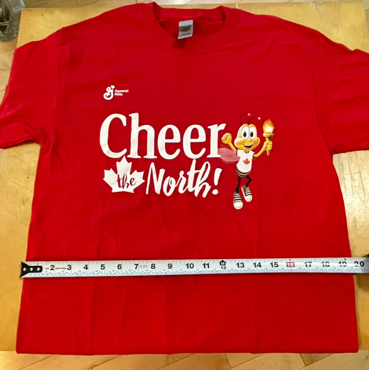 Selling a red t-shirt with a General Mills logo and the words 'Cheer on the North!' It also features the cute bee character holding a torch with a Canadian flag on its body.