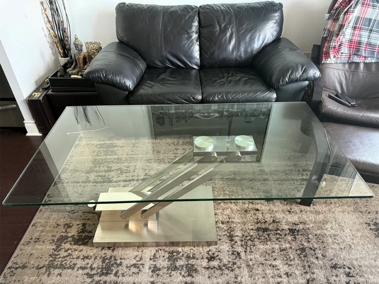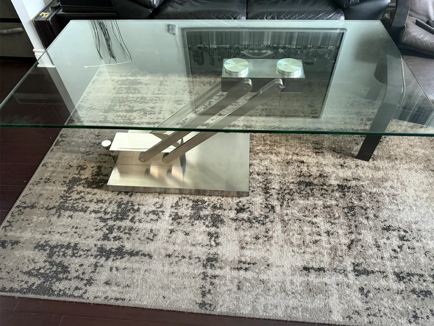 Selling a modern glass coffee table with a unique silver base! It's in great condition and would look fantastic in any living room. The sleek design adds a touch of elegance to your space. Adjust to different heights