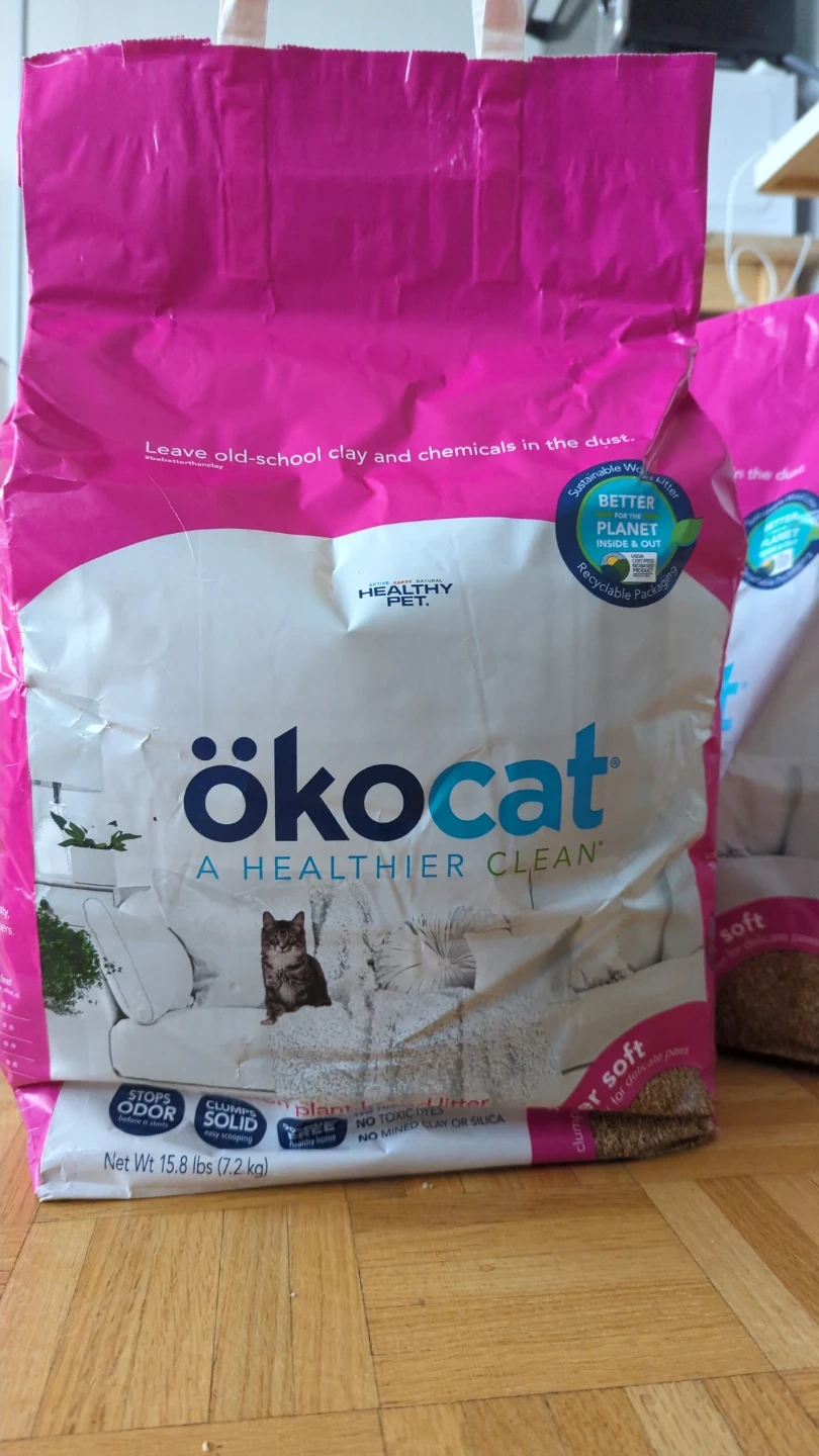 94Selling 1.5 bag of Ökocat clumping wood cat litter. Net weight is 15.8 lbs (7.2 kg) I have one brand new bag and one half used. Please take both together.