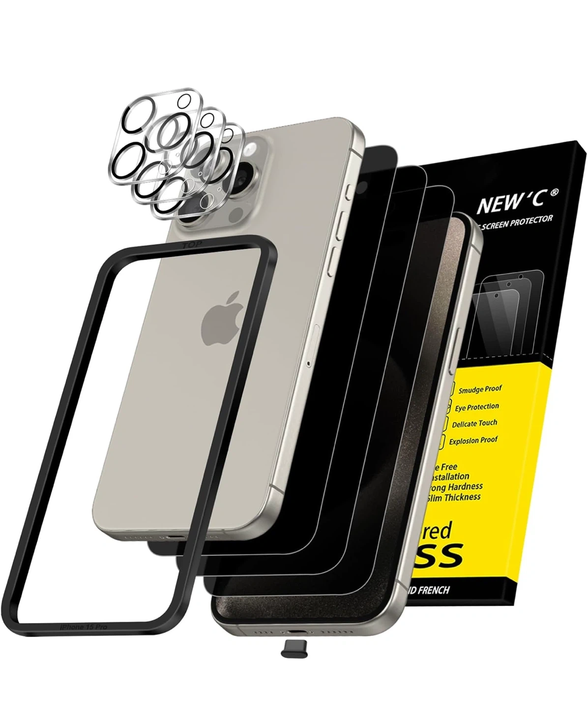 Selling a brand new New'c screen protector for the iPhone 15 Pro. It features easy installation using the included guide frame, ensuring correct alignment. It's designed to protect your information with a balance of privacy and eye protection. Also features a dustproof protection interface to prevent dust and dirt from entering the charging port