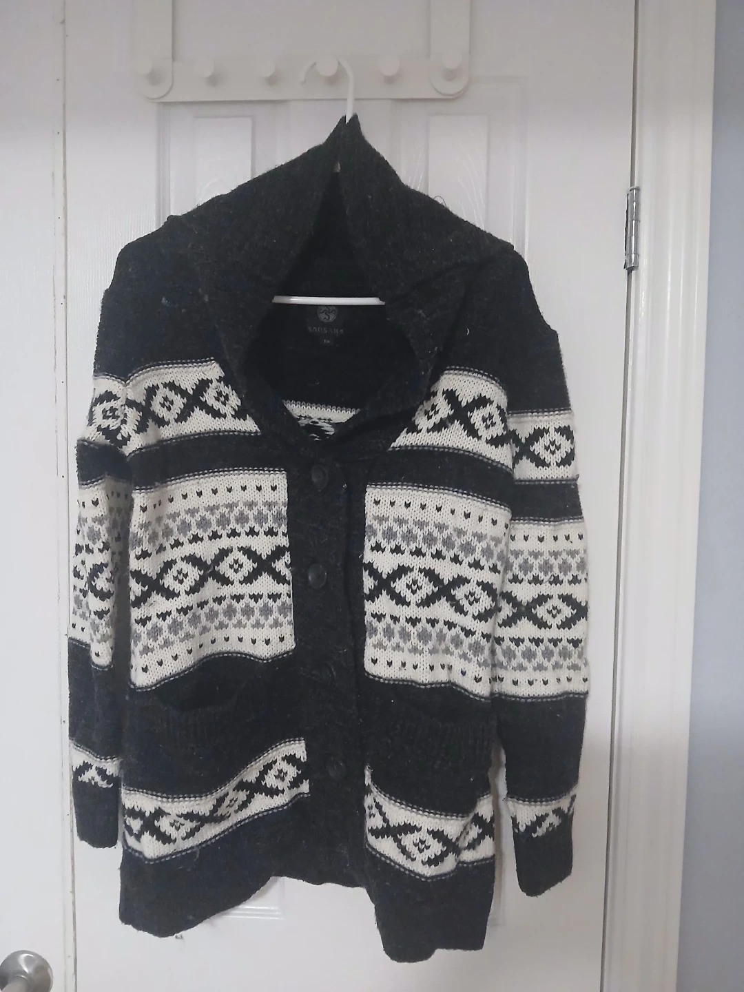 Cozy Sansara cardigan in size S/P! It features a shawl collar, button-up closure, and a unique patterned design. Perfect for layering during the cooler months