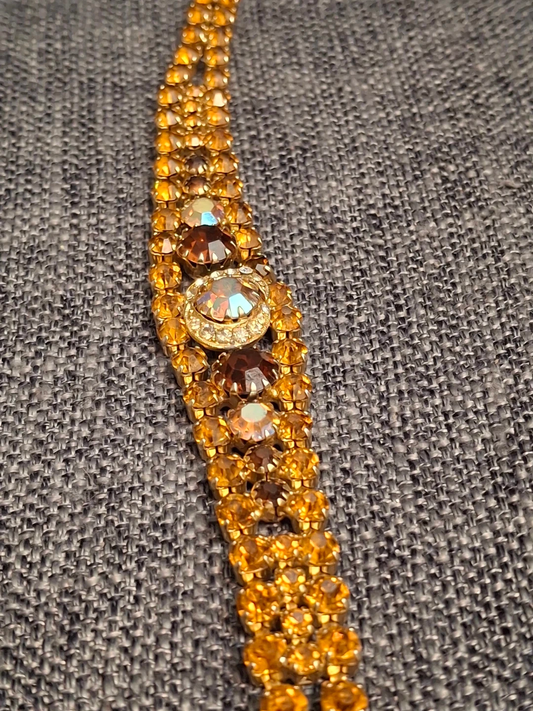 Here's a lovely vintage gold-tone bracelet! It features beautiful amber and brown rhinestones in a repeating pattern. It's in great condition and would make a nice addition to any jewelry collection