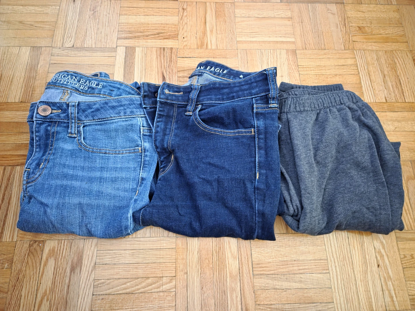 Giving away for free two pairs of American Eagle jeans in size 2 short and one pair of Grey sweatpants from SWS in size small.