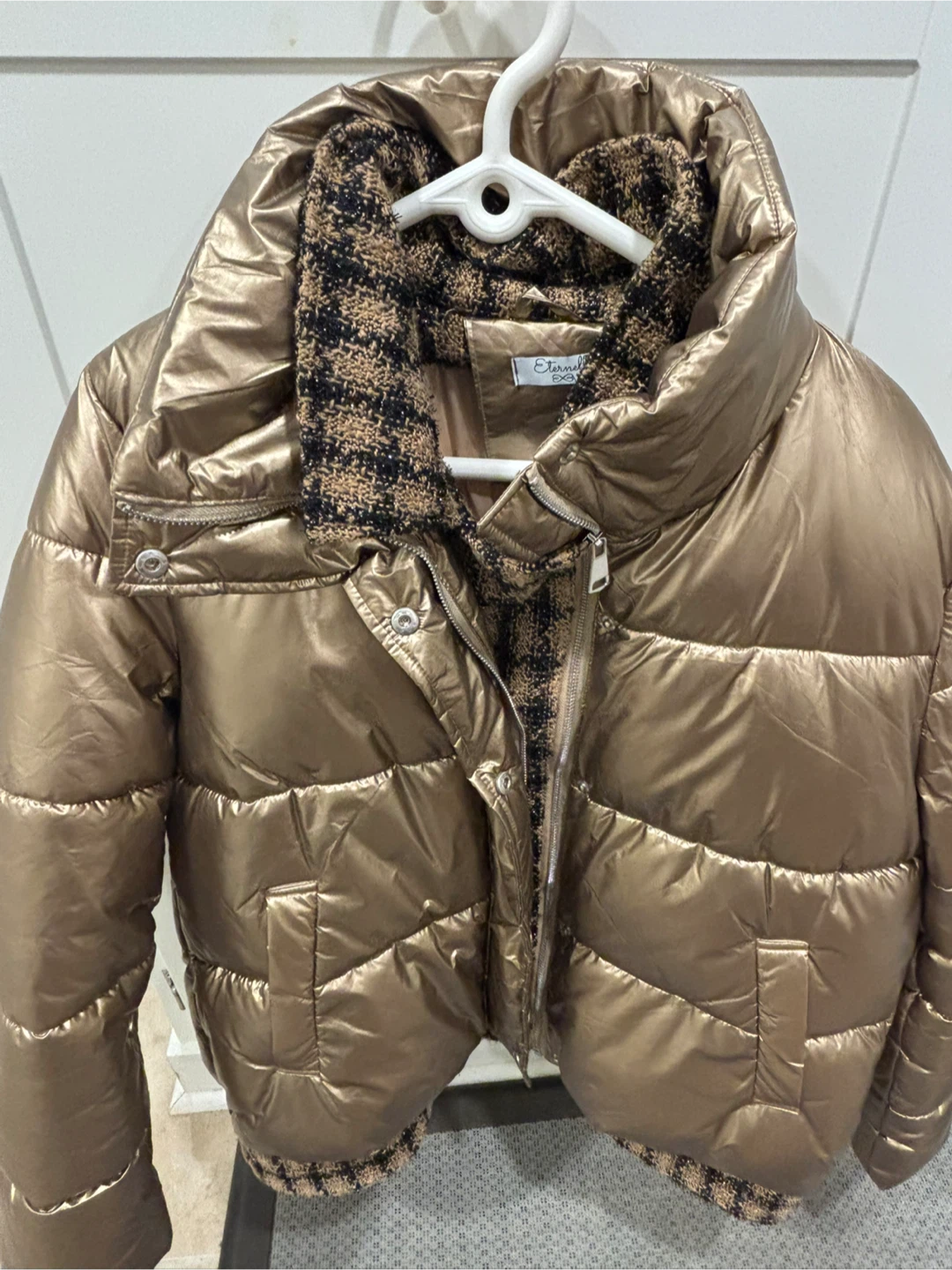 Selling a stylish Eternelle puffer jacket! It's a beautiful gold colour and features a unique houndstooth pattern around the collar and hem. Perfect for staying warm and fashionable during the colder months