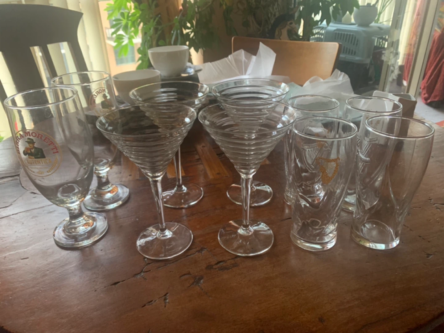 Selling a mixed set of branded beer and cocktail glasses. There's a Birra Moretti beer glass, some cocktail glasses, and a Guinness beer glass. Great for stocking your home bar!
