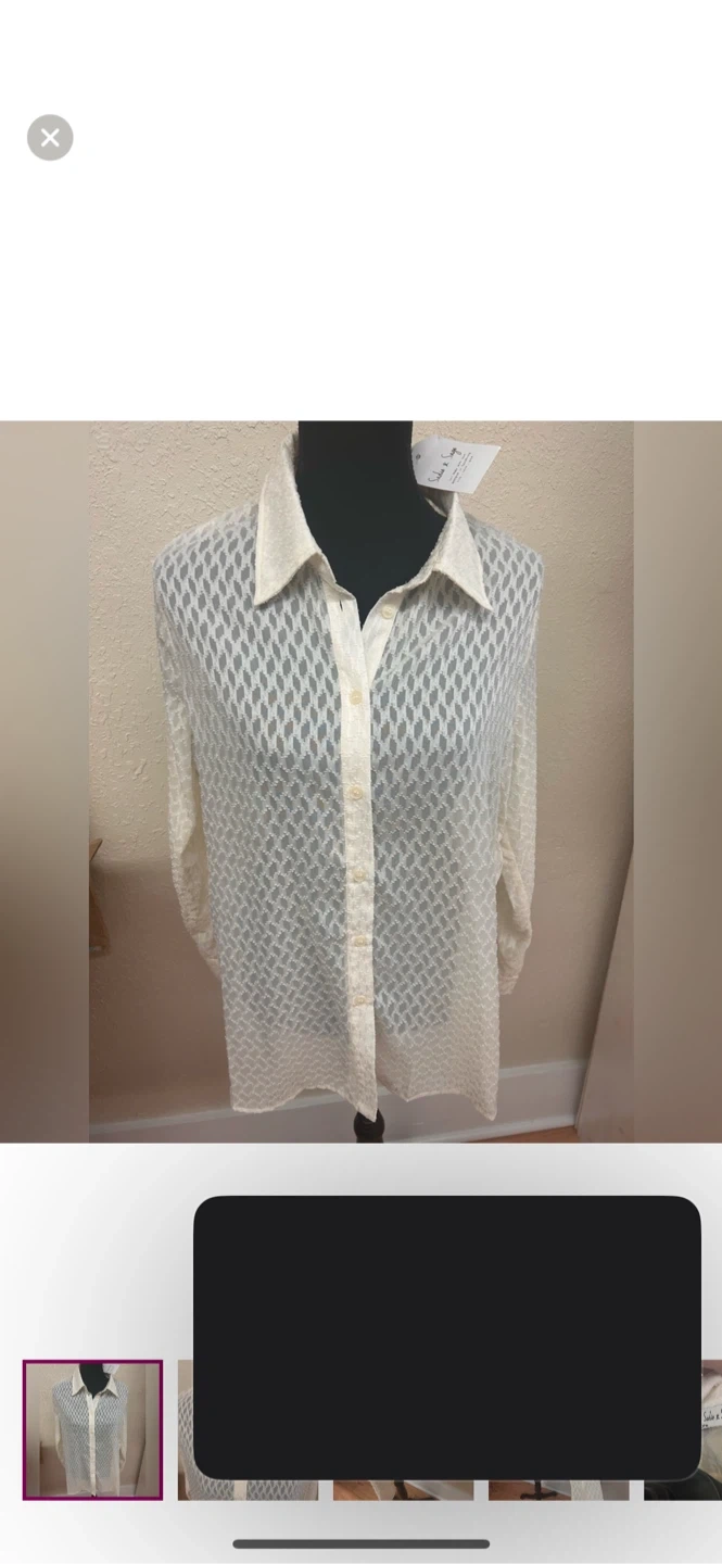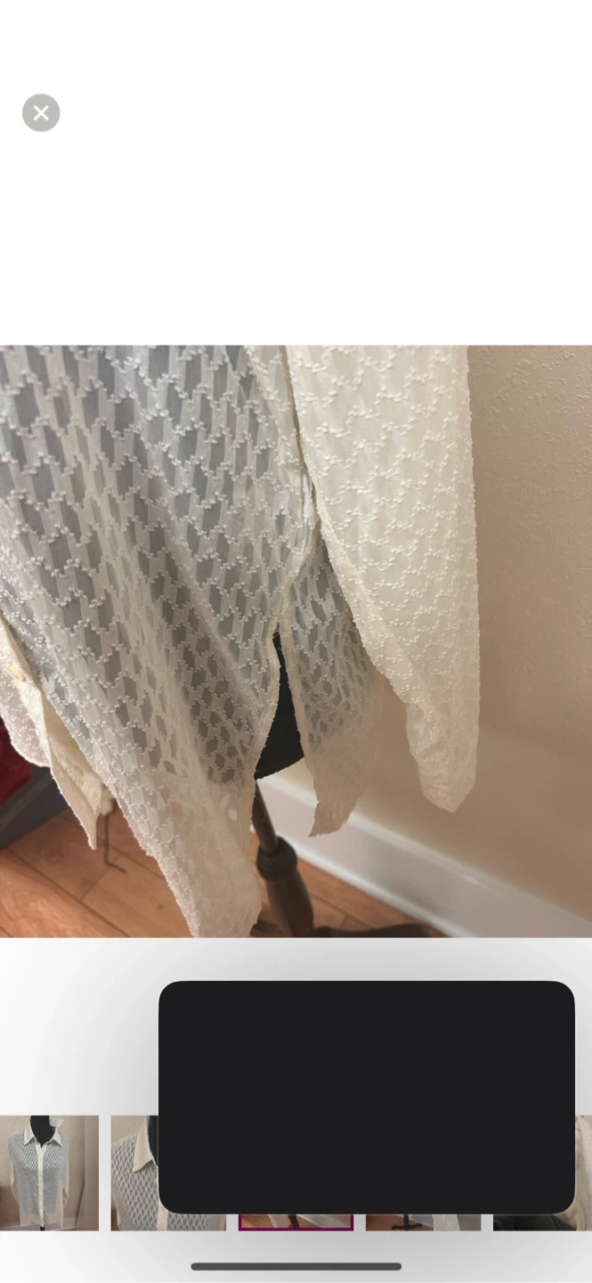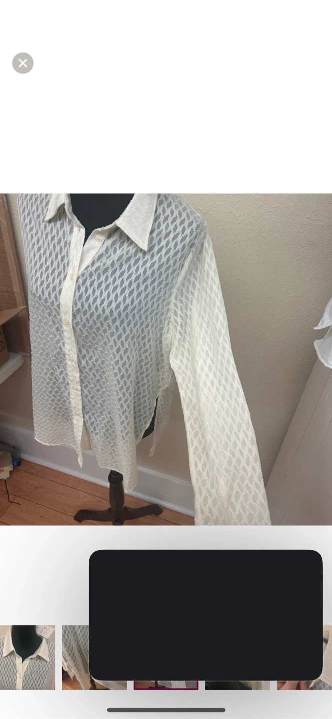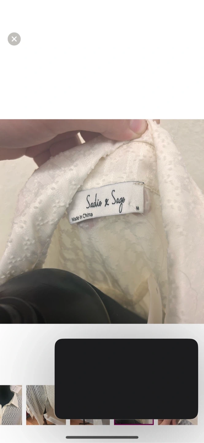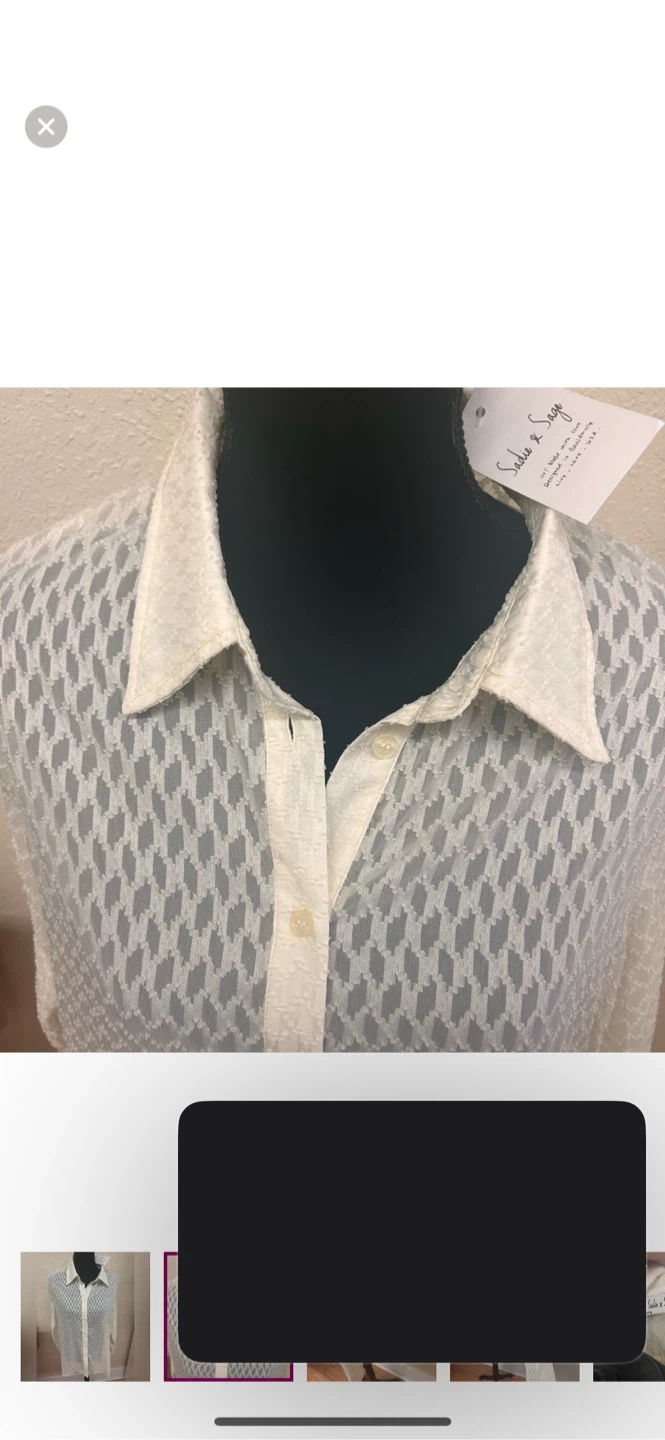 12Sadie & sage brand. Button up collard sheer blouse. White diamond print. Size medium. Brand new with tags Pit to pit 22” $25 Pickup Kincardine area or Peterborough but I can arrange delivery in port Elgin, walkerton-Durham, wingham-listowel-kw/cambridge/guelph, goderich-bayfield, & Arthur-Orangeville-Newmarket-Lindsay AREAS.