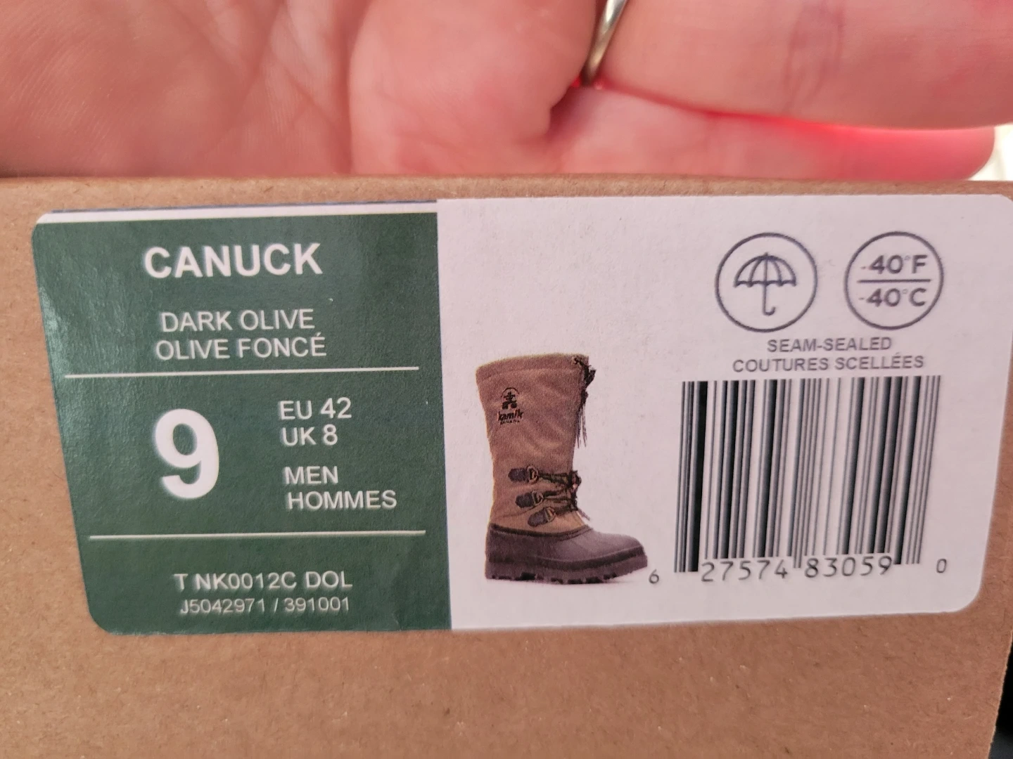 Selling an unused pair of kamik winter boots in dark olive, size 9 mens. They are seam-sealed and rated for temperatures down to -40°C.