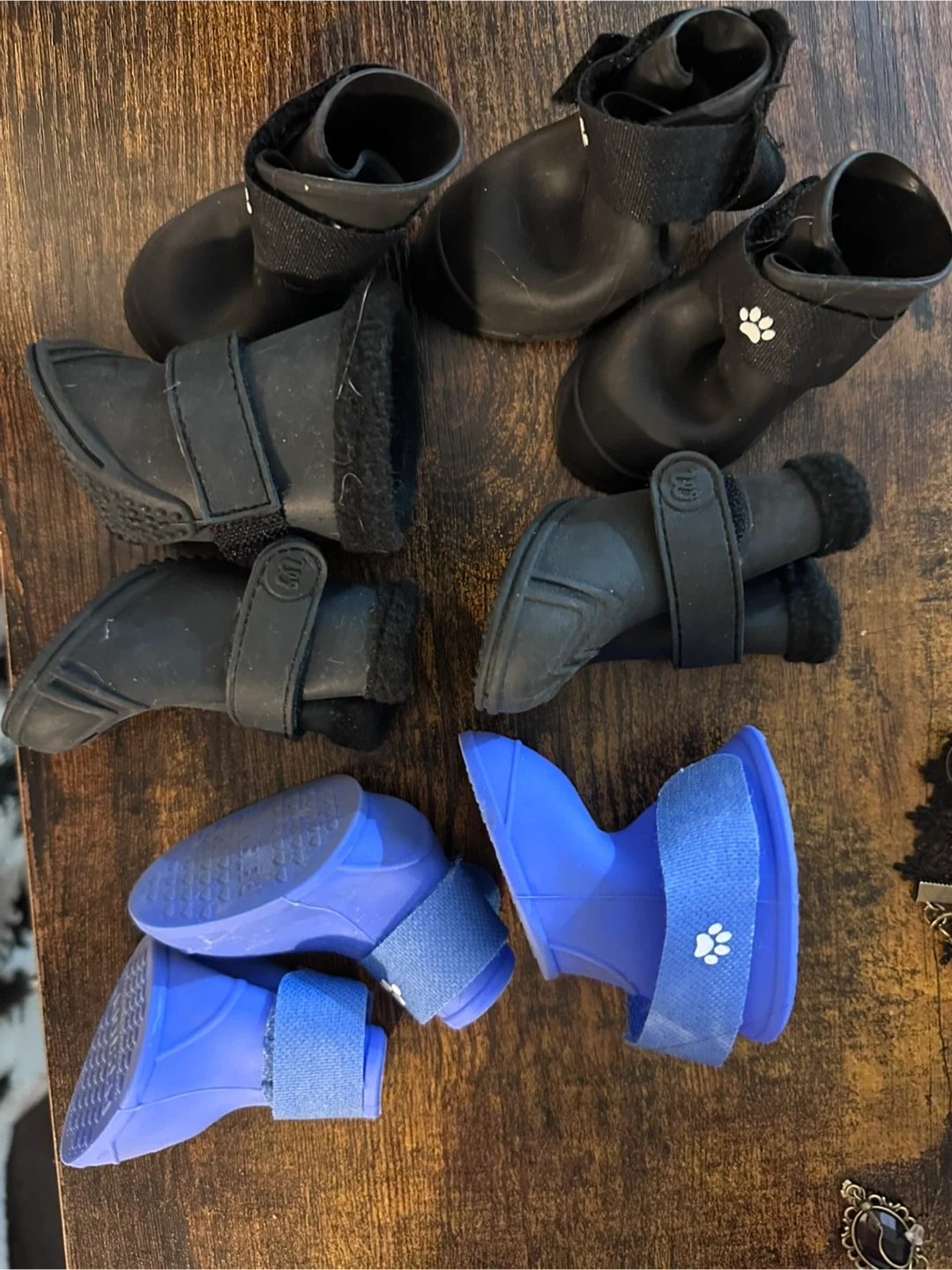 Sets of dog boots in black and blue! These are perfect for protecting your furry friend's paws during walks, no matter the weather.