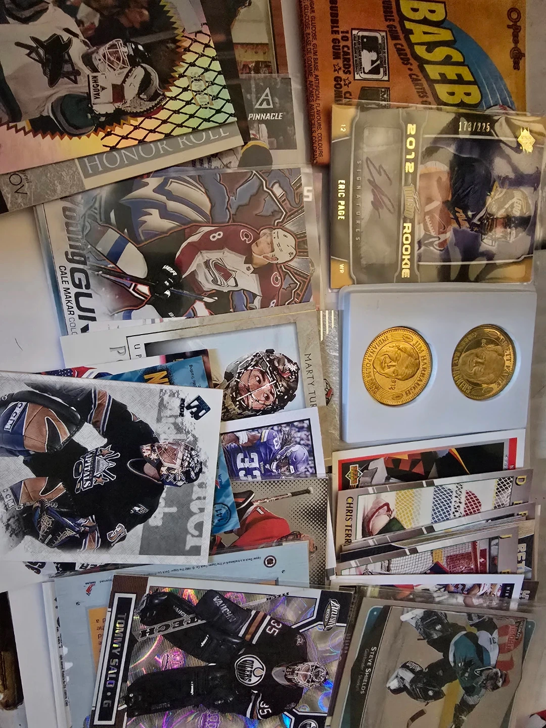 26Selling a mixed lot of hockey trading cards. Includes cards from Pinnacle, Upper Deck, and other brands. You'll find players like Cale Makar, Eric Page, and Tommy Salo among others. A great collection for any hockey fan!
