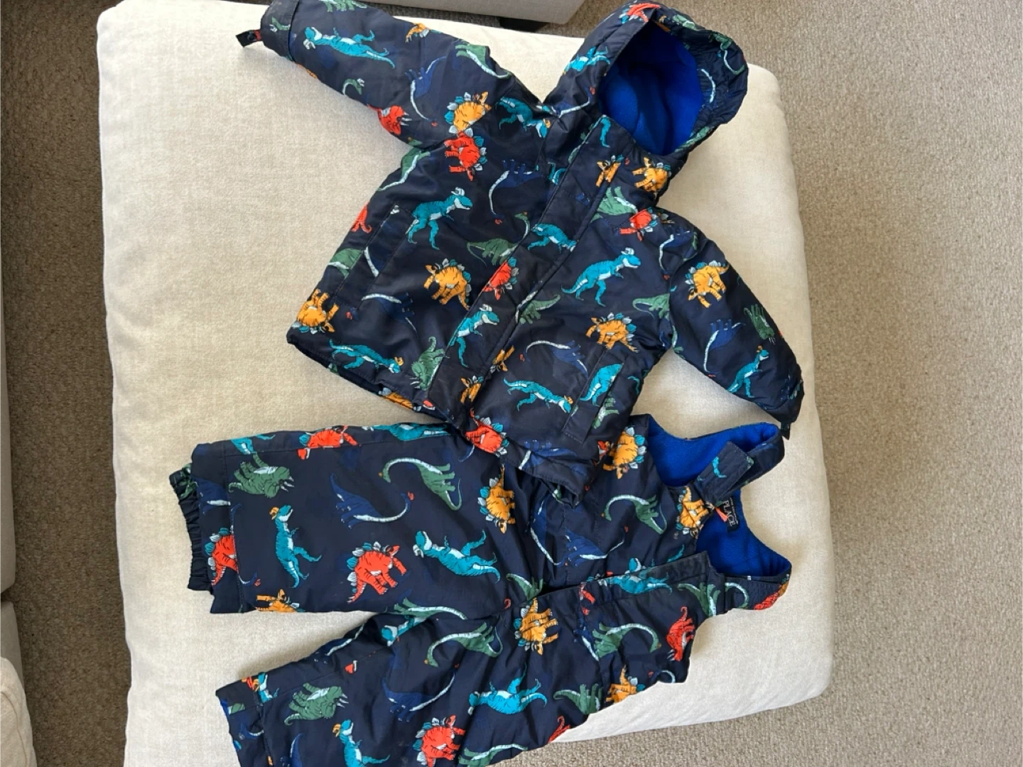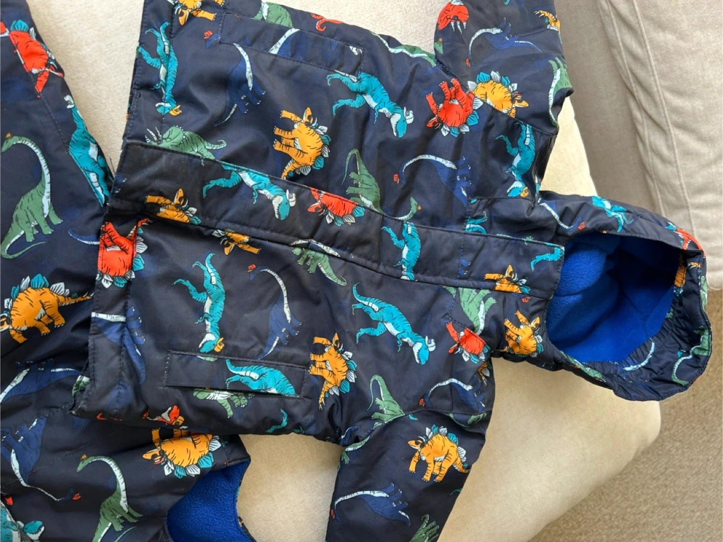 32A cute and cozy snowsuit from George, perfect for keeping your little one warm this winter! It features a fun dinosaur print in various colours on a navy background. The snowsuit includes both a hooded jacket and snow pants, both lined with soft blue fleece. Size 12-18 months.