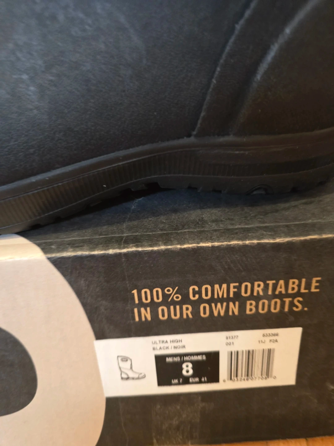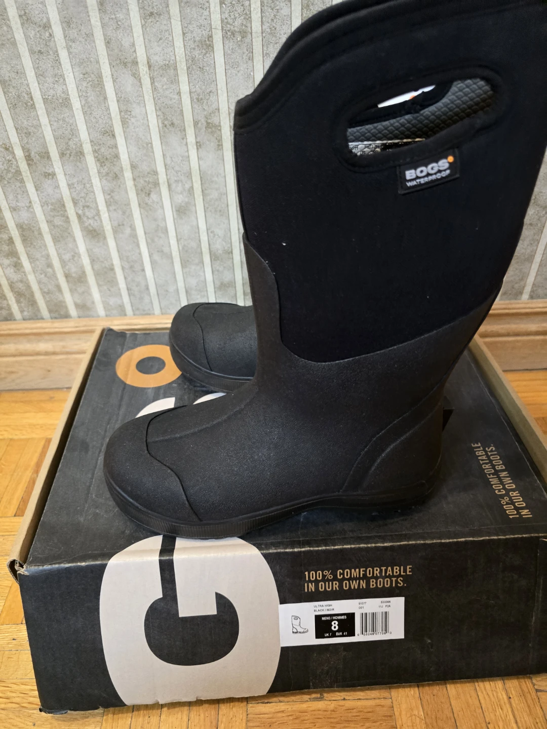 Selling a pair of Bogs Ultra High boots in black, men's size 8. These boots are 100% waterproof and rated to -40°C (-40°F), so they're perfect for our Canadian winters! They are in great condition and come with the original box