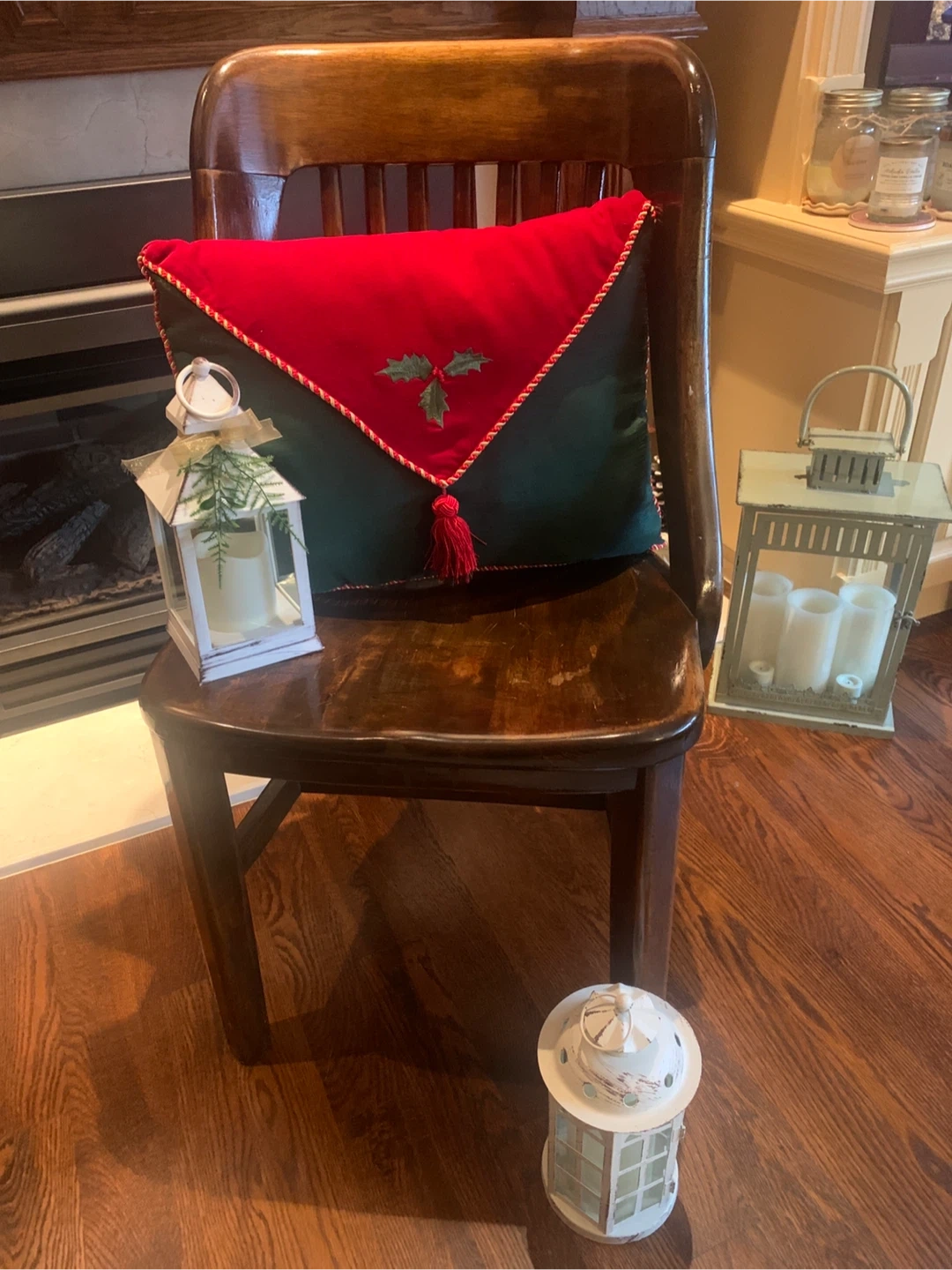 Festive decorative toss pillow in a classic Christmas colour scheme! It features a red velvety top section and a dark green bottom, separated by a gold and red rope trim with a tassel detail. A holly leaf design is embroidered on the front, adding a touch of holiday cheer to any room! It is in like new condition and ready to add to your holiday decor!