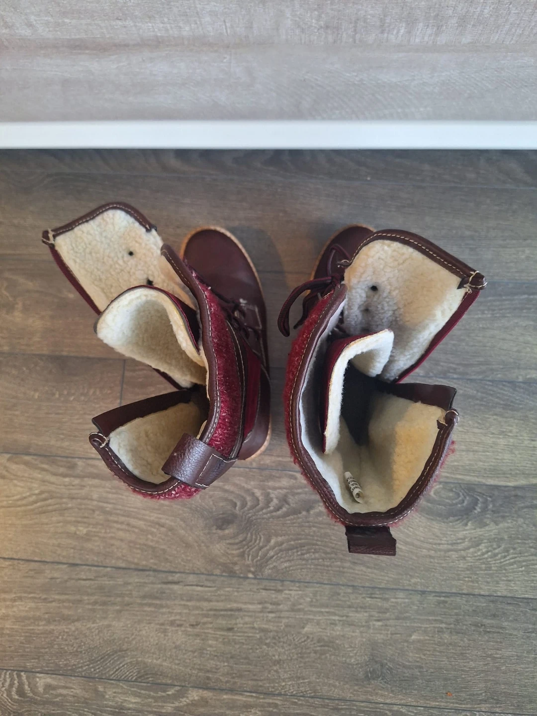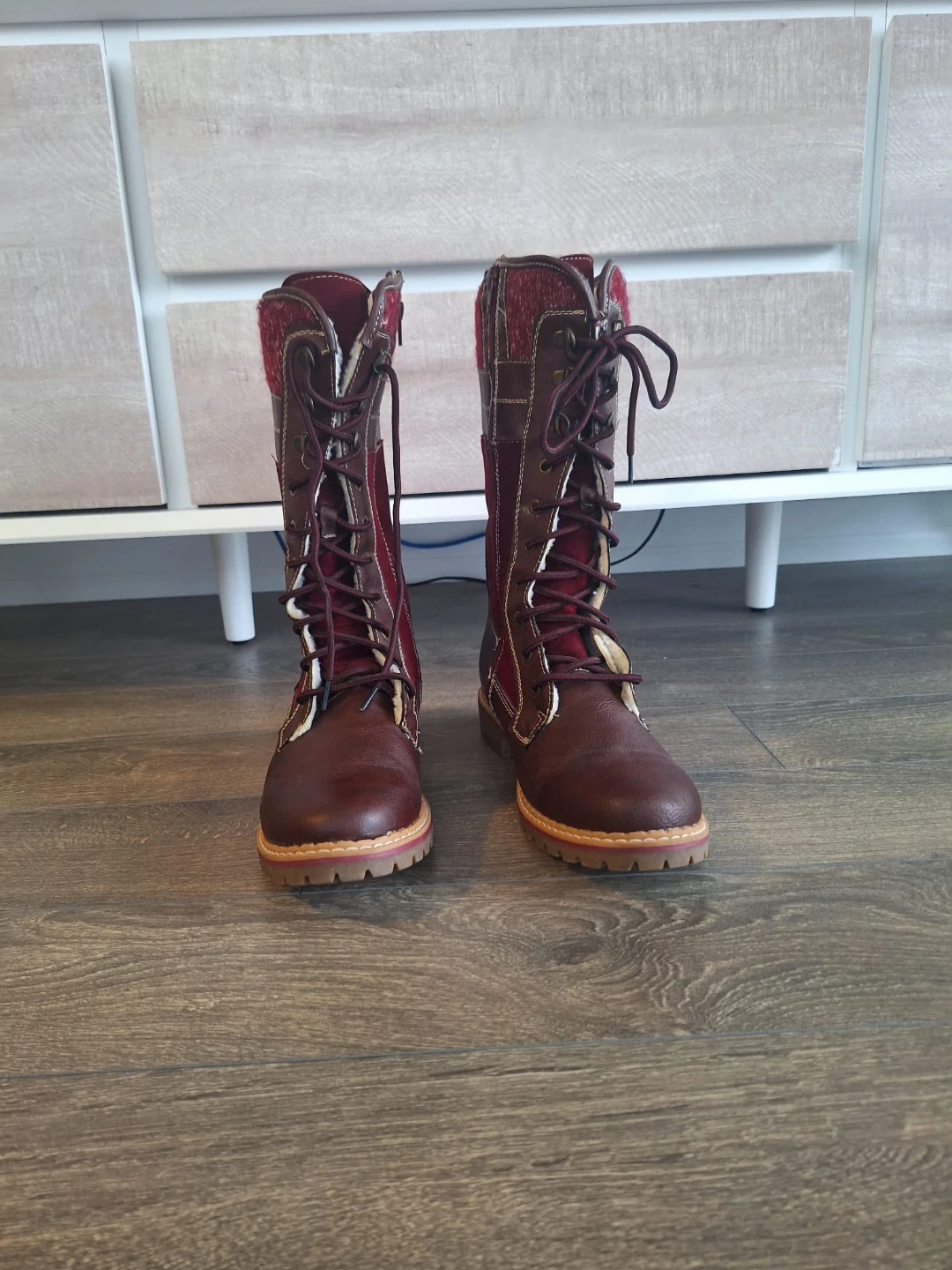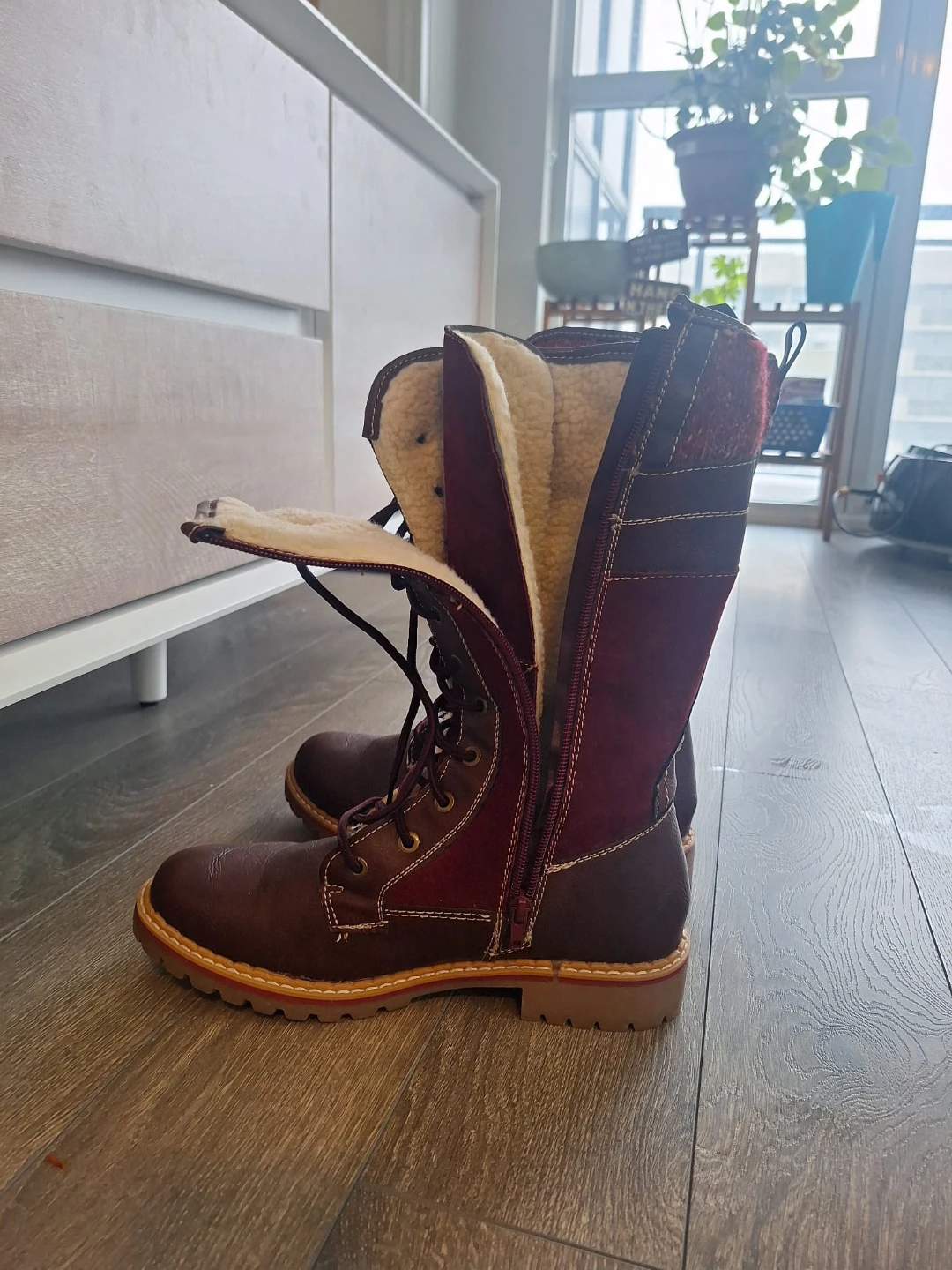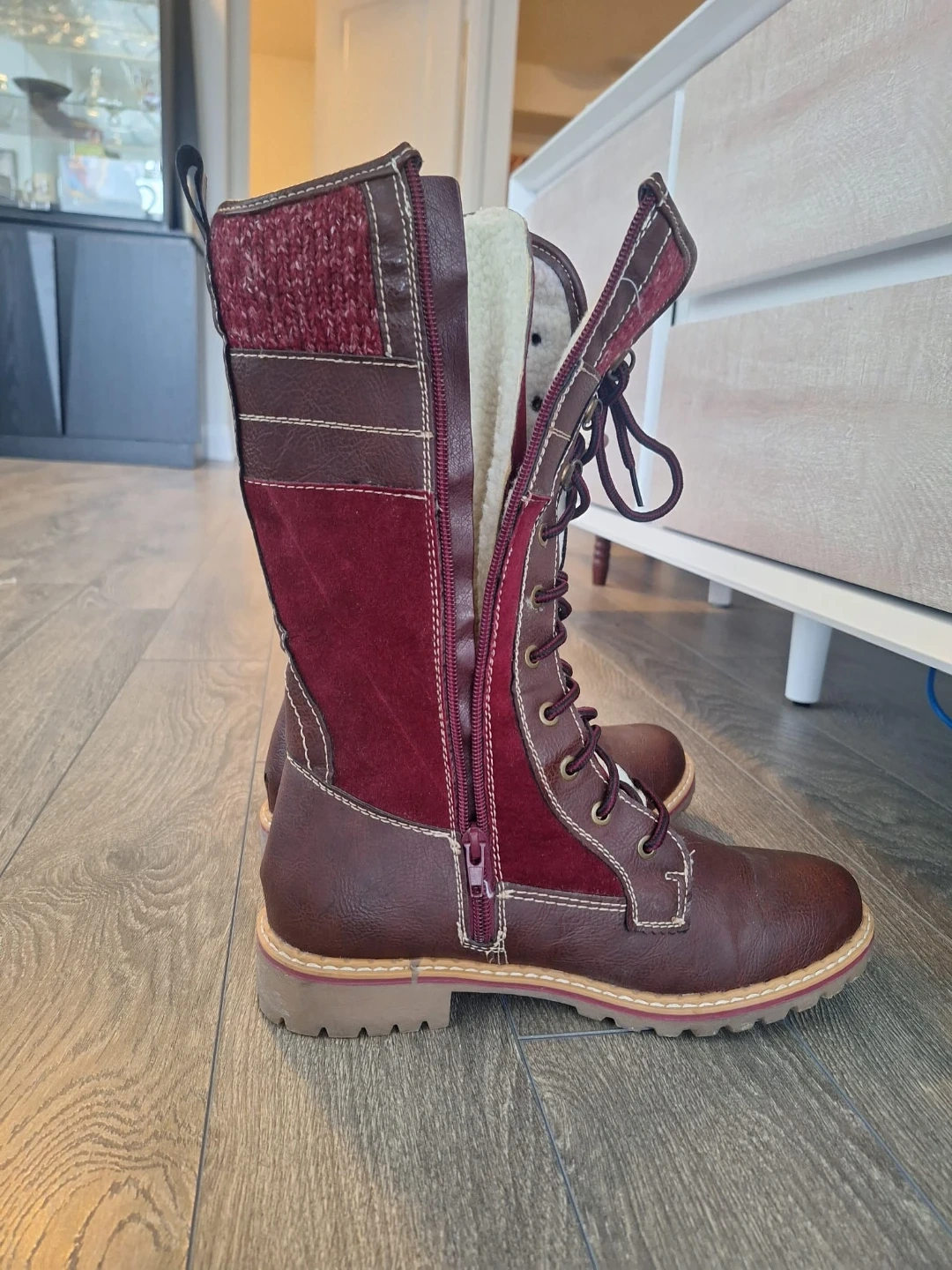 Cozy burgundy winter boots in size 9.They have a warm, faux-fur lining and a sturdy sole, perfect for keeping your feet warm and dry this winter