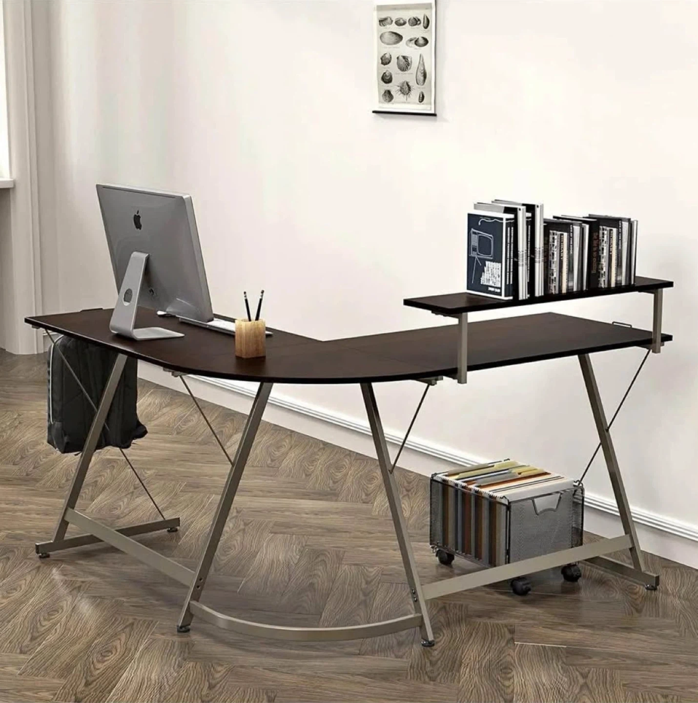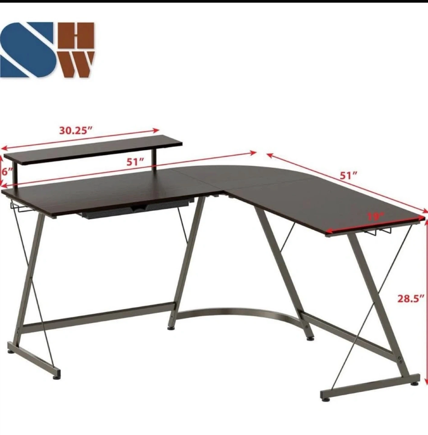 245Bought this for my parents but they never used it. It's never been assembled and all pieces are sealed in original bags. Box is not original. Paid $145 for it. Brand SHW. Espresso color. Minimalist style. L-Shaped Corner Design: Maximizes workspace efficiency with a 51" x 51" layout, perfect for fitting into corners while providing a wide surface area for multitasking. Built-In Monitor Stand: Includes an elevated shelf to position your monitor at eye level, improving posture and freeing up valuable desktop space. Integrated Storage Drawer: Features a convenient pull-out drawer to organize office supplies, gadgets, or personal items, helping to keep your workspace neat and tidy. Durable Construction: Crafted with a sturdy steel frame and laminated engineered wood desktop for long-lasting reliability and everyday use. Product dimensions: 19" D x 51" W x 28.5" H. (48.3 cm D x 129.5 cm W x 72.4 cm H) (51" overall depth)