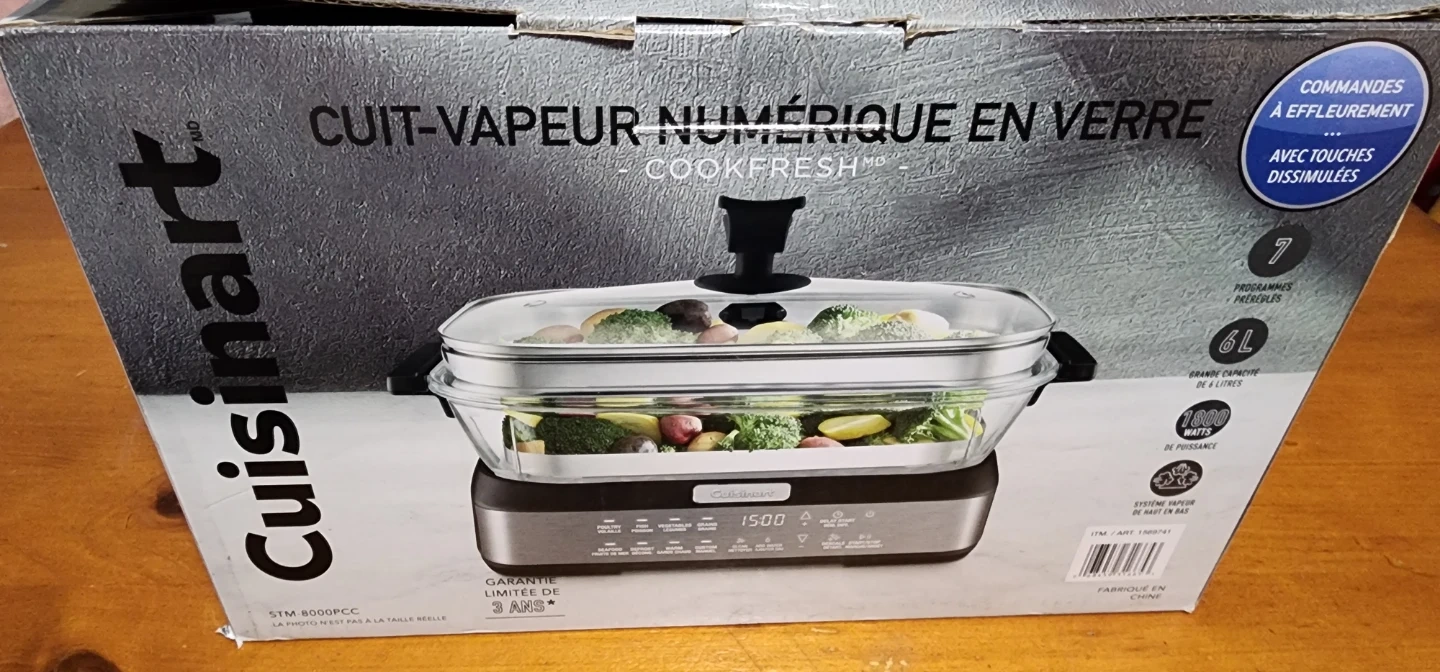 I'm selling a brand new Cuisinart CookFresh Digital Glass Steamer! It has a large upgraded 6-litre capacity and a removable water tank with a capacity of 1 litre of water, enough to cook a delicious meal! It also features a smart touch control, making it simple to use with just one click