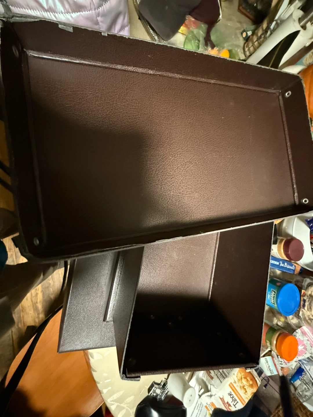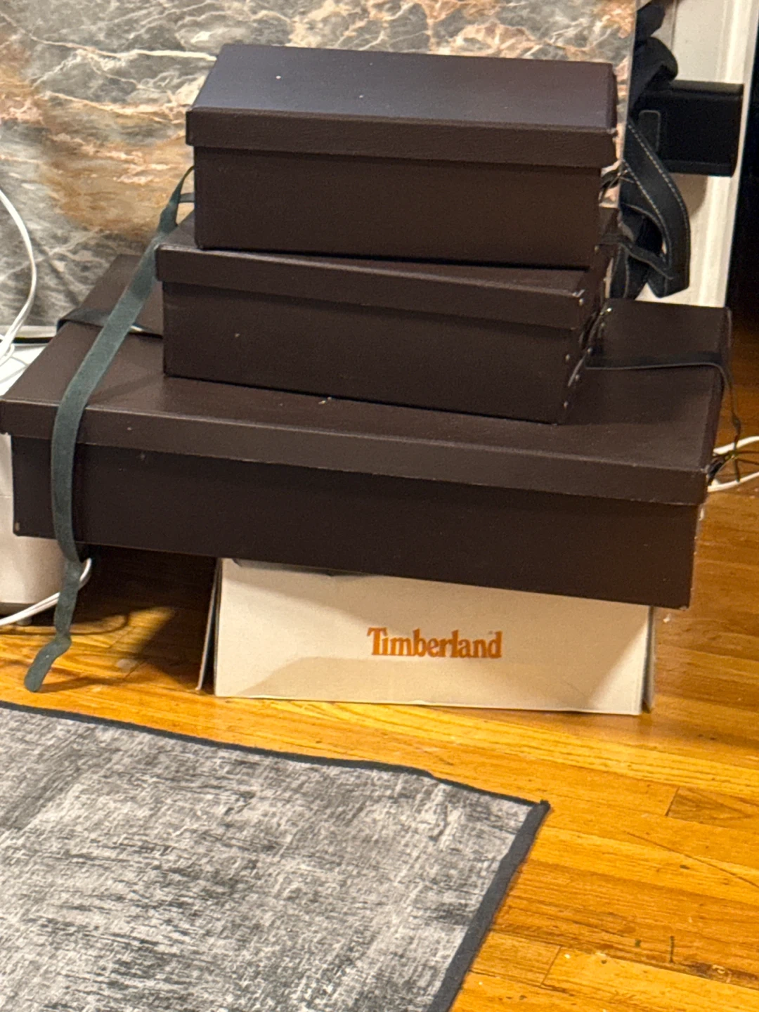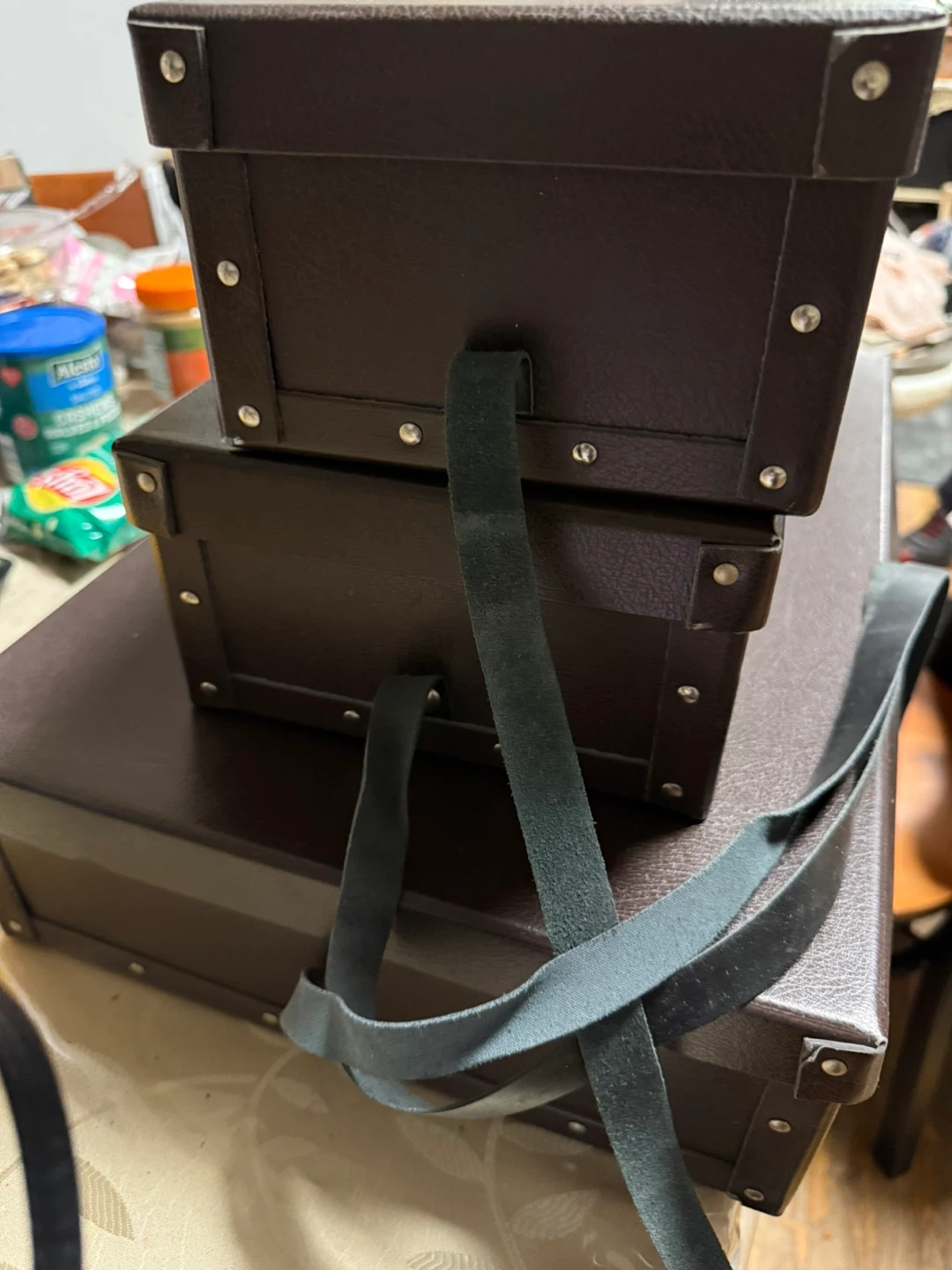 set of three vintage Atlas storage boxes. They have a unique look with leather straps and metal accents. Great for adding a touch of retro style to your home organization