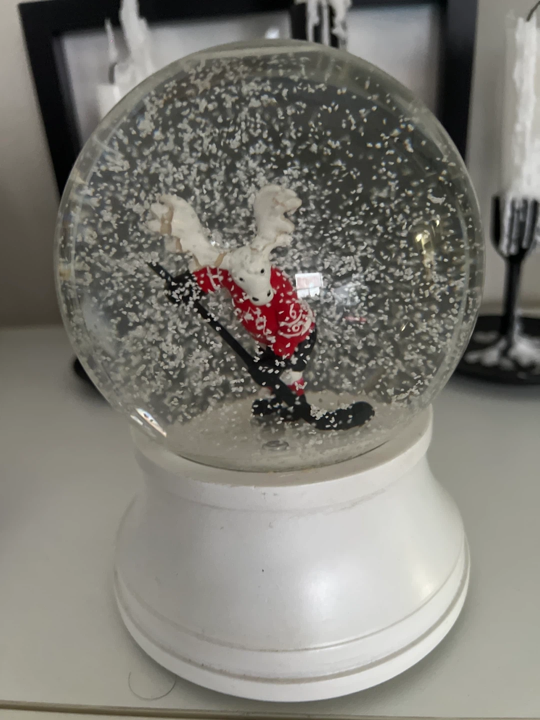 79I'm selling a cute snow globe featuring a moose playing hockey! It's in great condition and would be a fun addition to any room. It's got a wind-up music box on the bottom too! Wearing Canada jersey