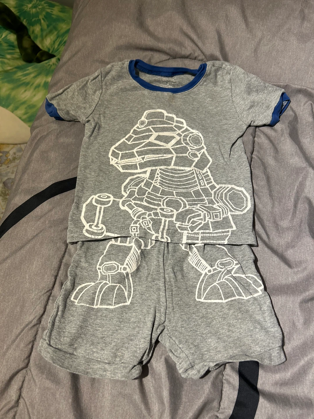 Cute OE Fresh pajama set for kids in size 4! The set features a grey t-shirt and shorts with a fun robot design. Perfect for a comfy night's sleep for your little one