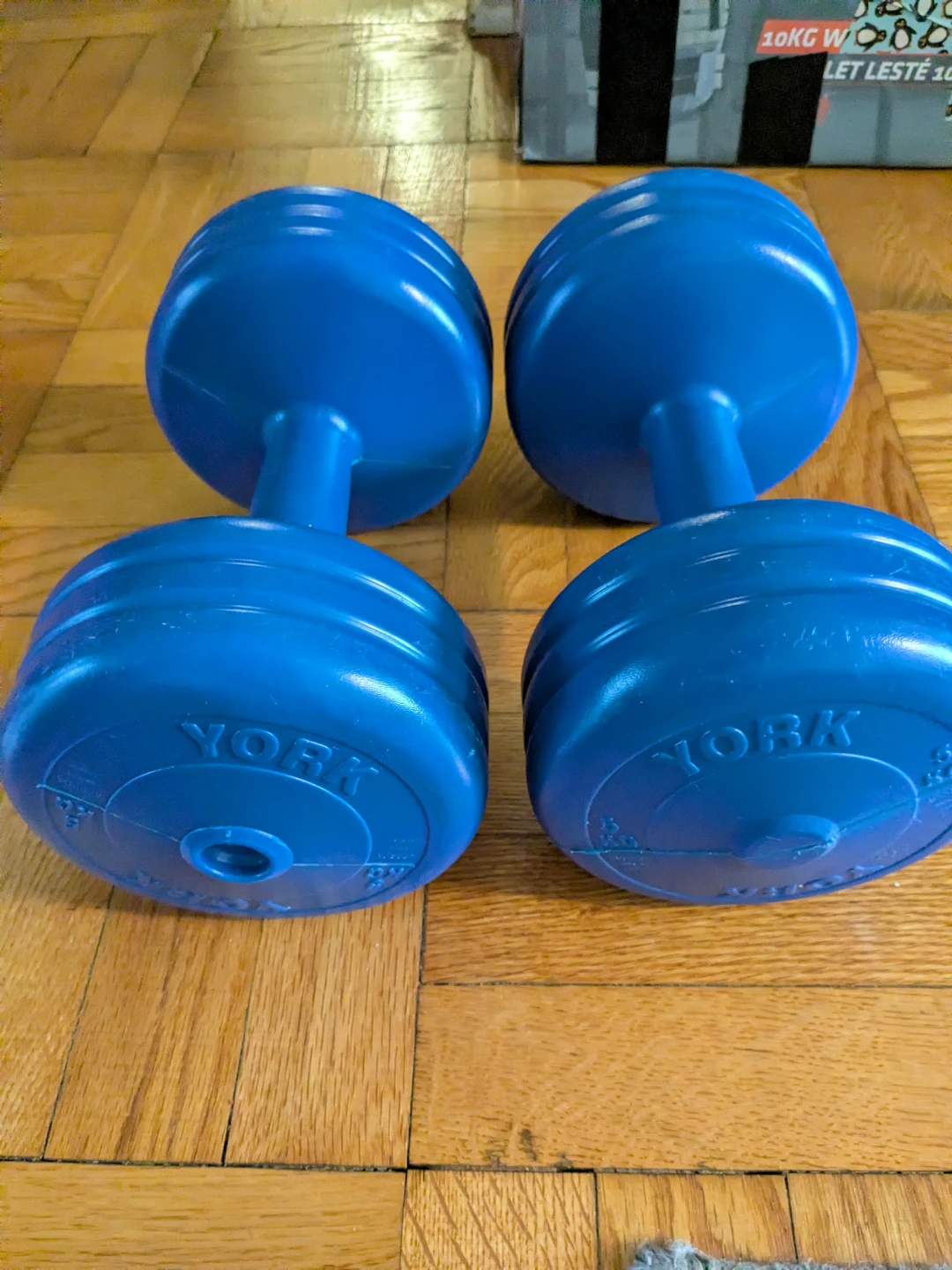 dumbbells in blue. They're in great shape and ready for your home workouts. Pickup is near Eglinton and Bathurst. Cash only please.