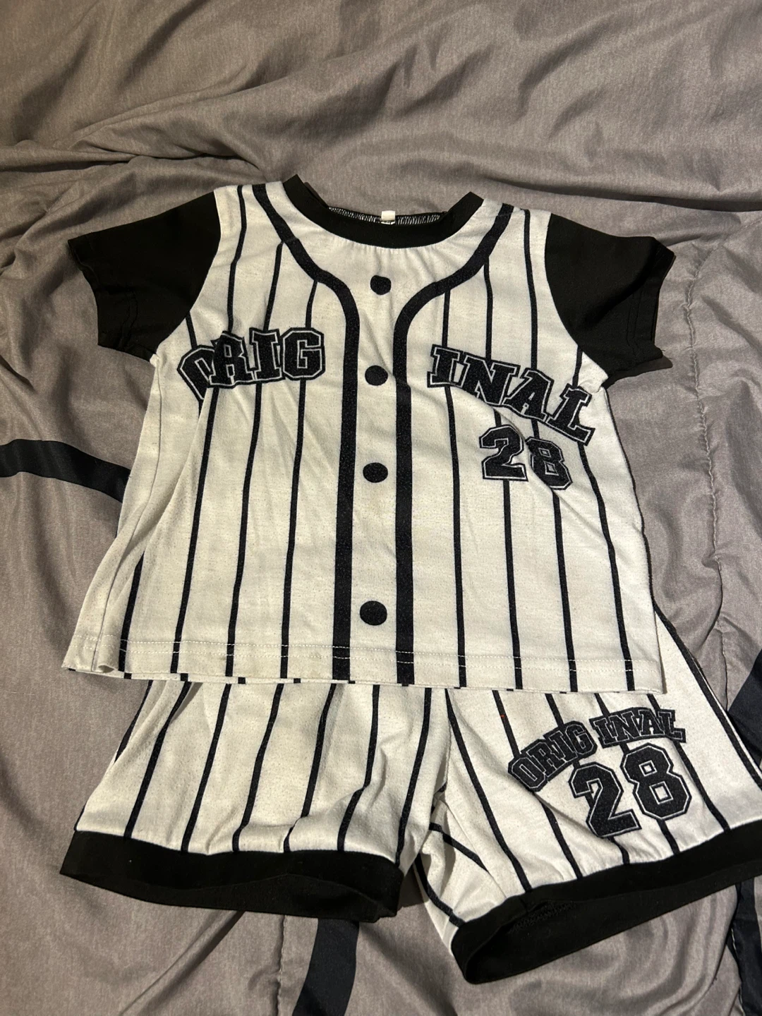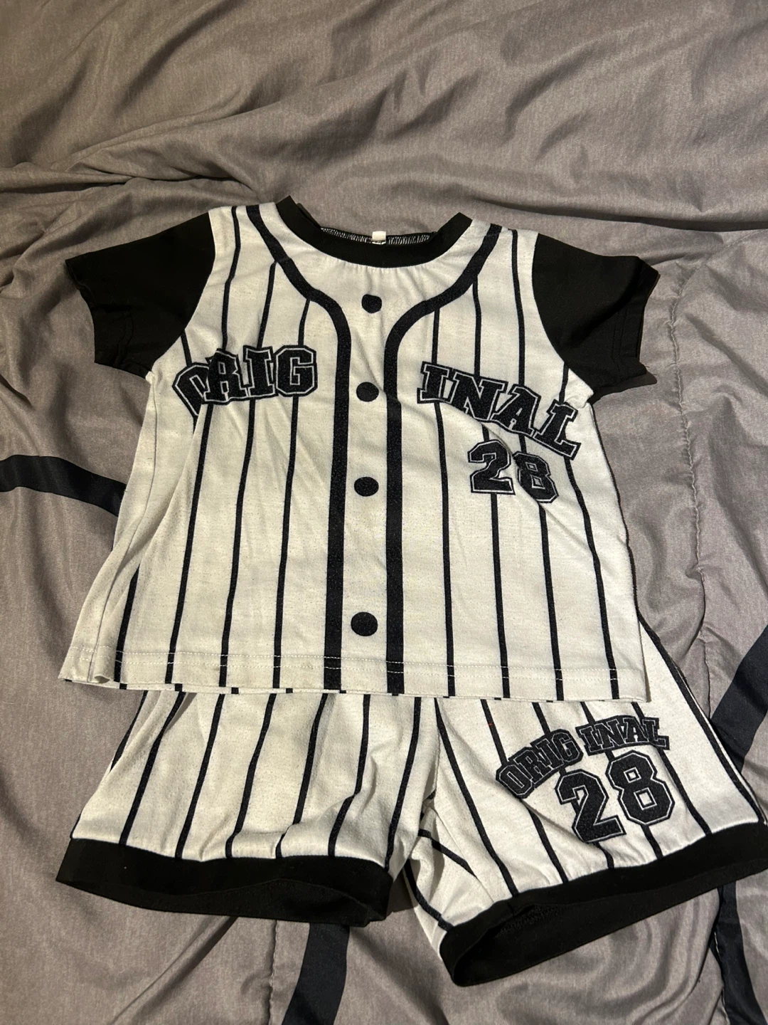 A cute baseball-themed outfit for your little one! It features a jersey-style top and matching shorts. The set is white with black stripes and black sleeves. The text on the outfit says "Original 28".