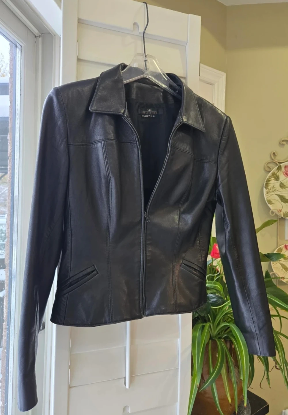 Here's a lovely black leather jacket in size 8! It's in great condition and ready for a new home. Perfect for adding a touch of style to any outfit
