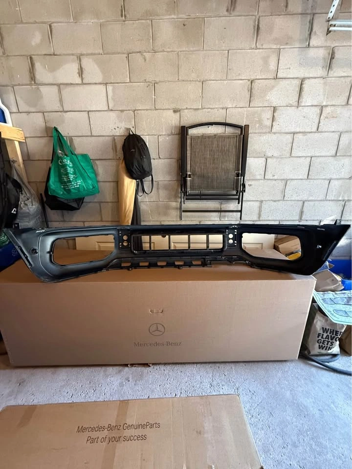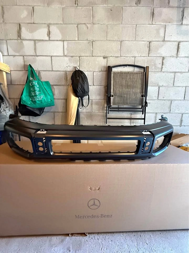 Front bumper off a 2024 G63 AMG. This bumper is for any G63 without a bullbar and I have a front rebar for it as well at an extra cost. This bumper is already painted in black magno matte paint. Brand new this bumper costs $2600 plus another $1500 atleast to get it painted. This saves you the paint cost and alot more rather than buying new as the condition is like new basically.