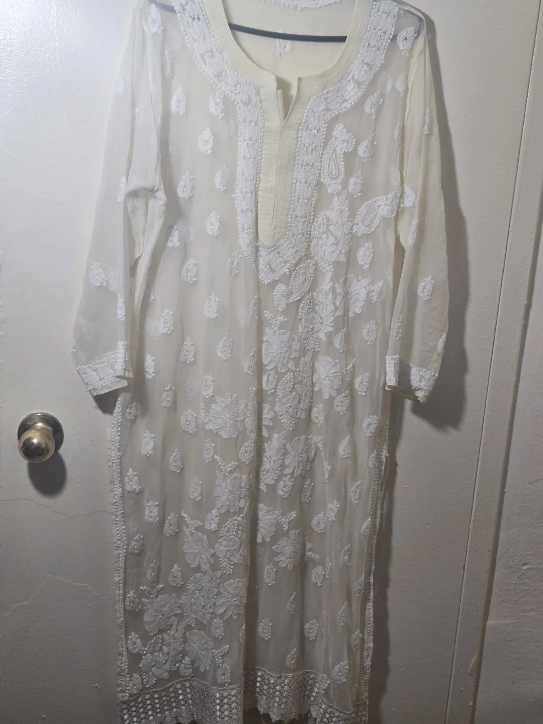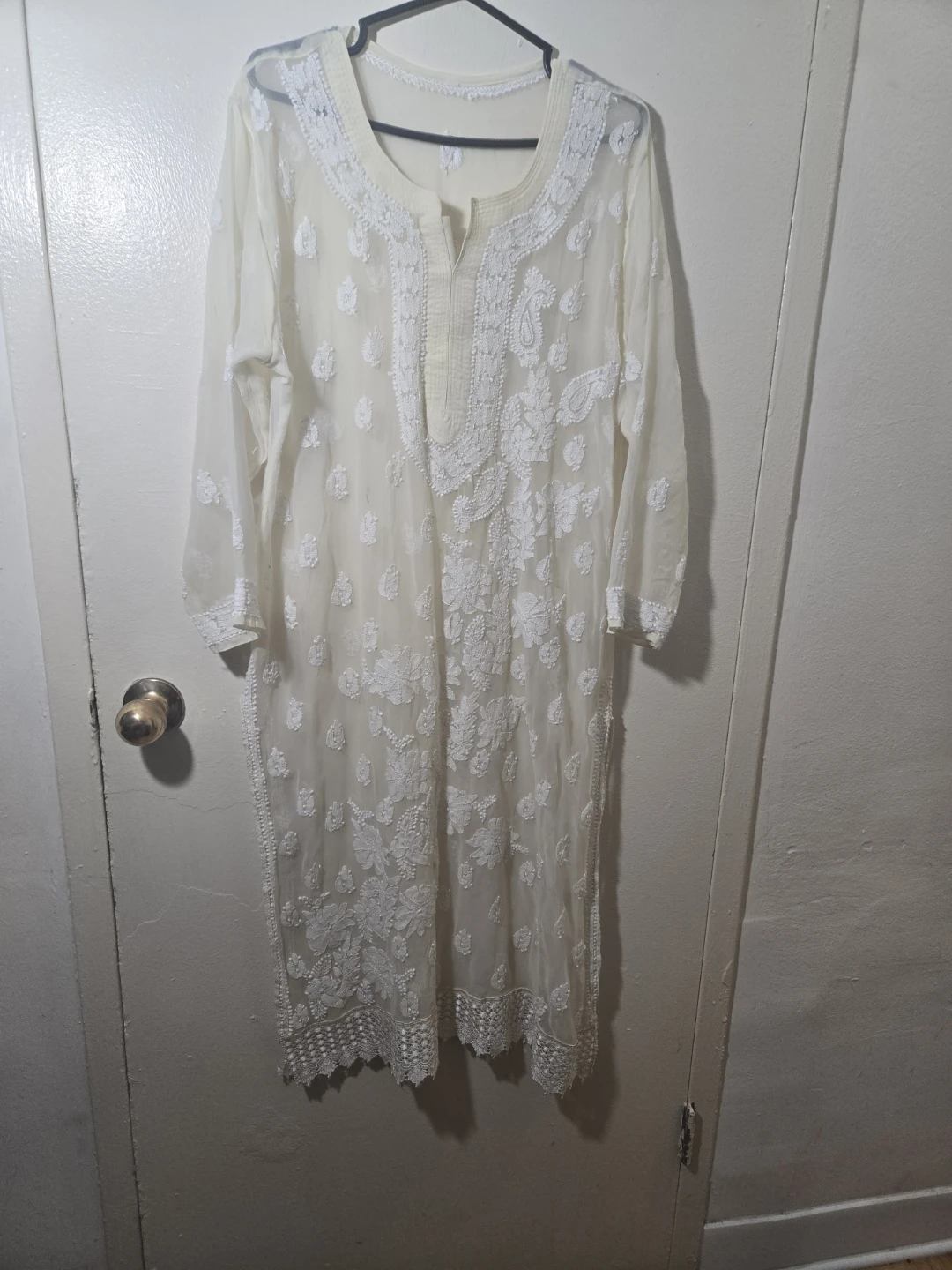 This is a beautiful white kurti dress with intricate embroidery. It's perfect for a special occasion or just to add a touch of elegance to your everyday style. The dress is in great condition and has been well cared for. It's made from a lightweight and breathable fabric, making it comfortable to wear in warmer weather. Feel free to ask any questions!