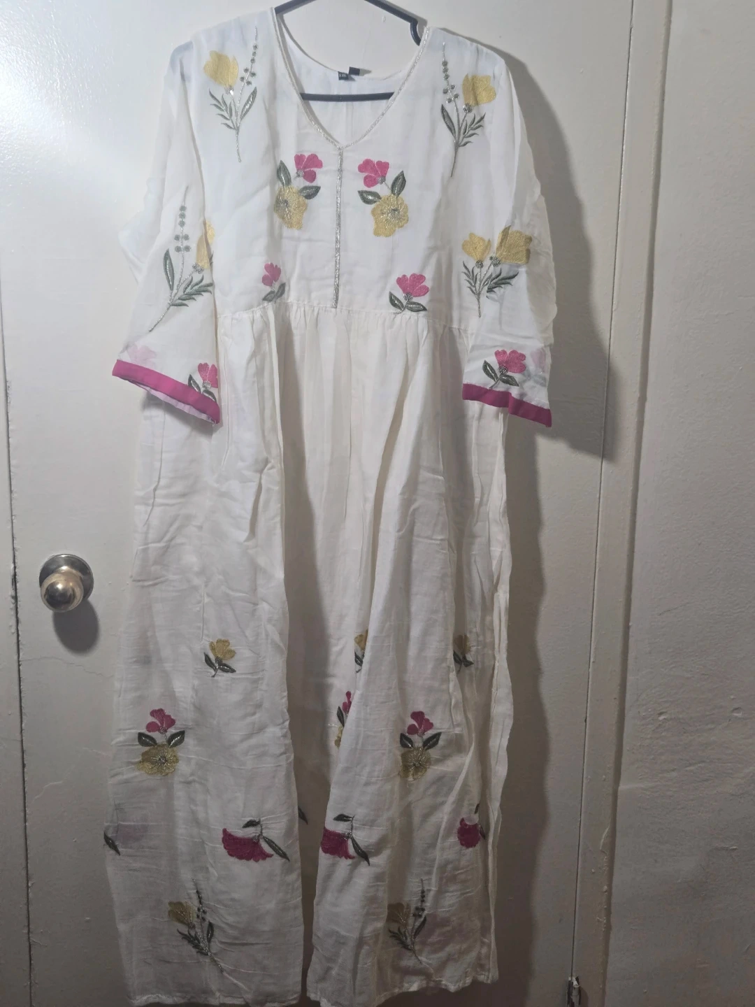 136A lovely white dress with beautiful floral embroidery!. The dress features delicate pink and yellow flower designs, adding a touch of elegance. Perfect for party, spring or summer!
