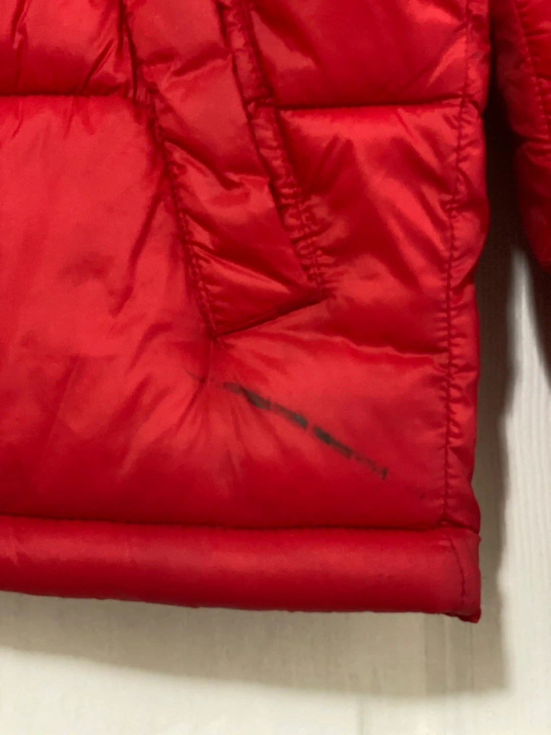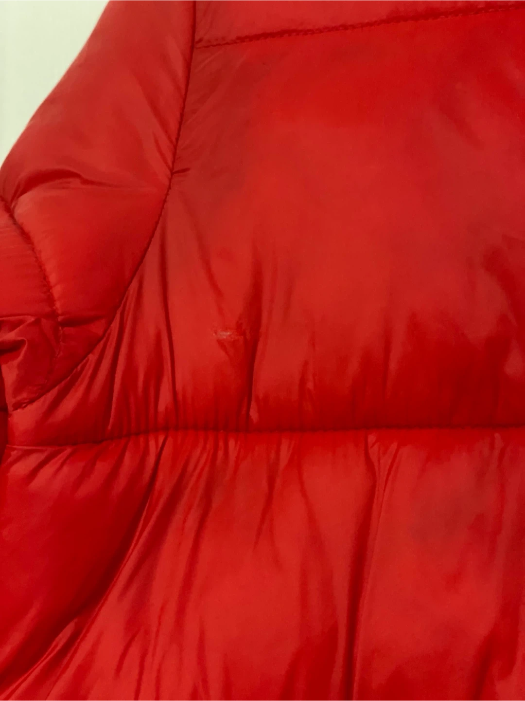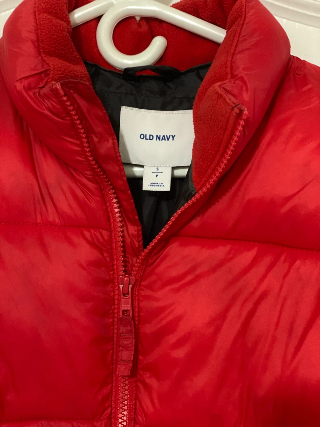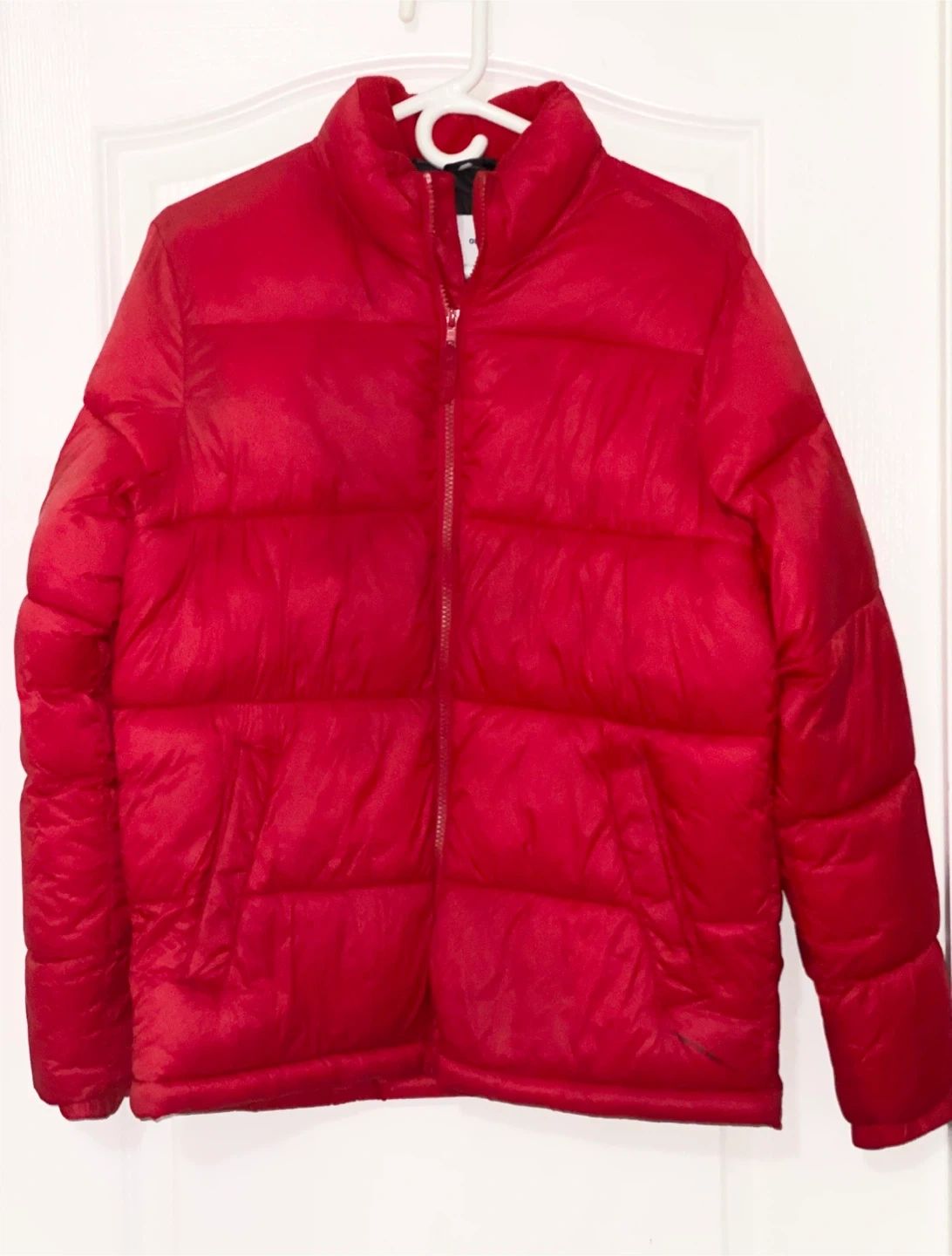 Selling a red puffer jacket from Old Navy in size small. There are some signs of use, including a small mark on the front and a tiny hole. Still lots of life left in it!