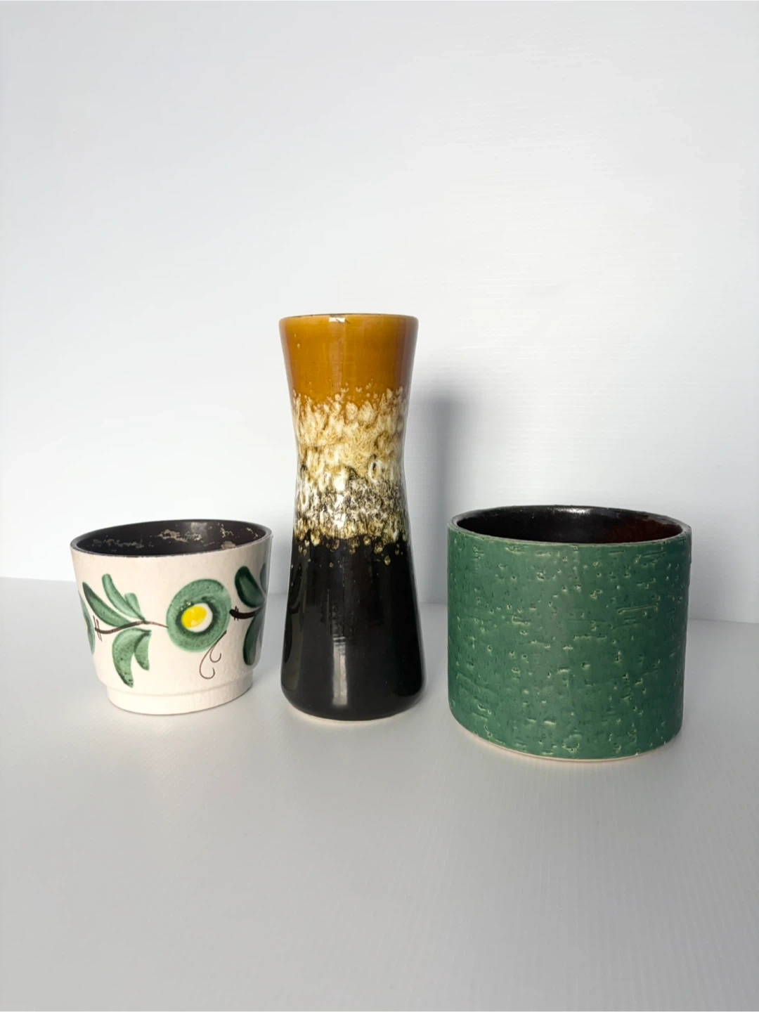 A group of 3 vintage mcm west Germany vase planters. The tall one has a hairline crack but still presents perfectly. Selling as a group