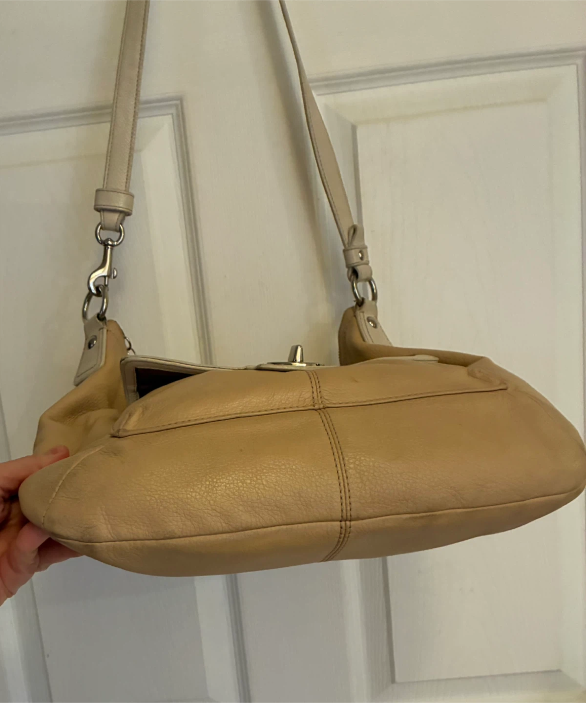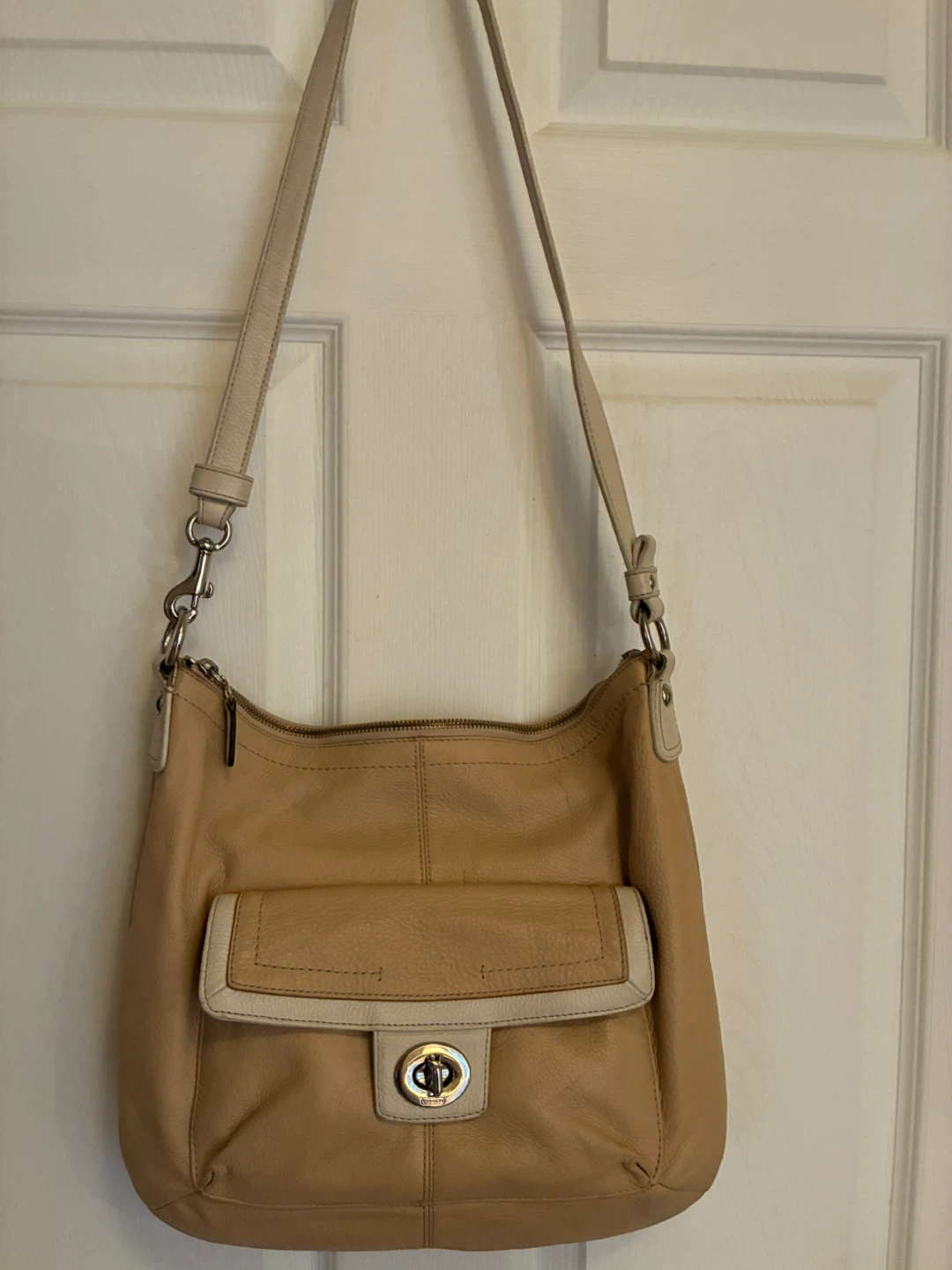 Gently used authentic Coach shoulder bag in a beige/cream colour. Made of soft, supple leather and has a classic design. The bag features a turn-lock closure and a convenient front pocket.