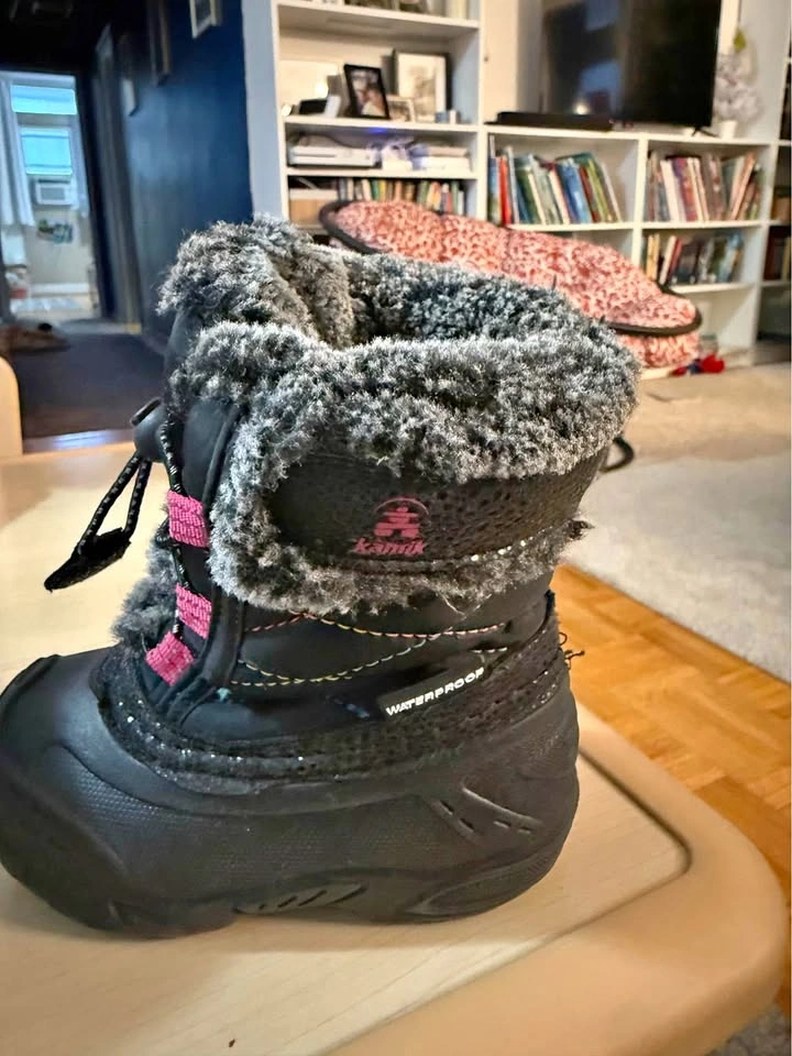 15Whether she's sledding downhill, building her dream snow castle, or making snow angels with friends, these toddler girls' Star winter boots will keep her feet warm and dry all day long. Made of nylon upper with a waterproof seam-sealed construction, these vegan-friendly boots have a bungee lacing system and an Easy-Grab Lace Lock closure to help keep snow away. Fixed foam and fleece insulation keep her feeling toasty, while moisture-wicking faux fur lining help keep feet dry. Features she'll enjoy include rainbow stitching details, plush faux fur collar, NiteRays reflective technology for enhanced nighttime visibility, - 40°C cold rating, and an ICEWAVE outsole with multi-directional tread for reliable traction on snowy terrains. Made in Canada. Brand new never worn. Bought last year thinking they would fit this year and they don’t! Pick up midtown Toronto. Retails for $60 plus tax. Selling for half price. Size 6 toddler
