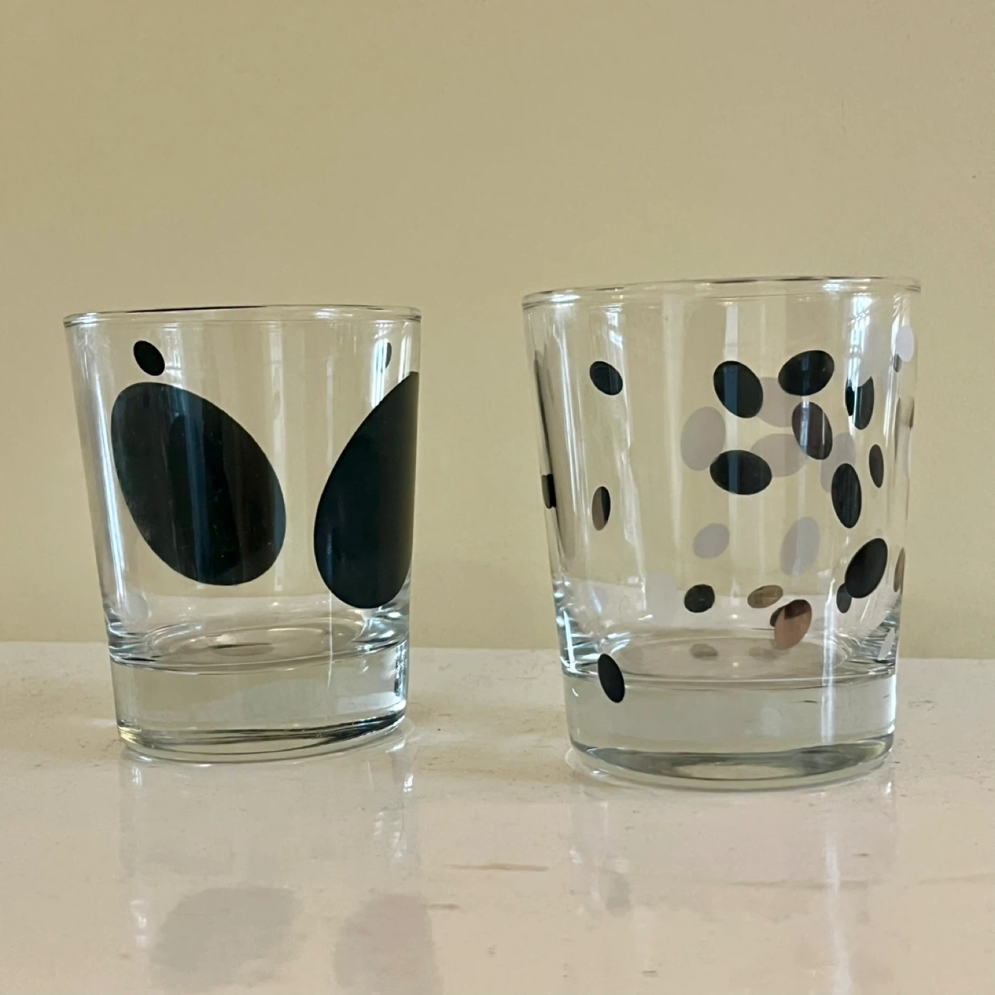 Set of four retired IKEA Spilltid black, white & silver dots/circles glasses. Two are in excellent condition and two are slightly faded from use. You’re getting a great deal - only paying for the two in great shape, the other two are a bonus!