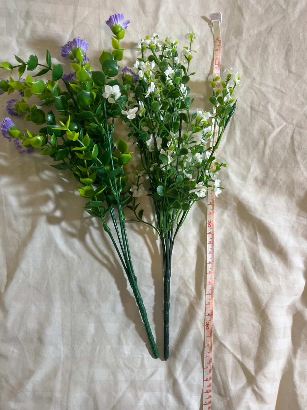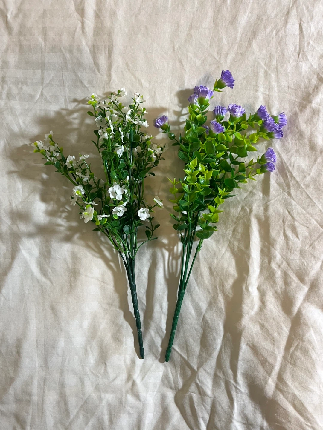 Selling a bundle of artificial flowers! These are perfect for adding a touch of colour to any room. One bunch features pretty purple flowers, while the other has delicate white blooms. They're in great condition and ready to brighten up your space.