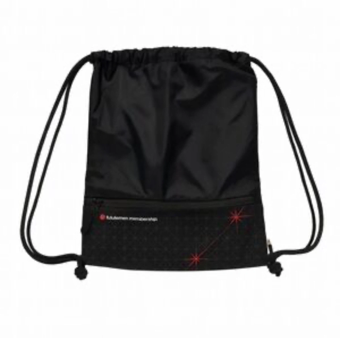 Selling a Lululemon drawstring bag in black. It's in great condition and perfect for carrying your gym clothes or everyday essentials! The bag features a front zipper pocket with "Lululemon membership" printed on it. It's lightweight and easy to carry around