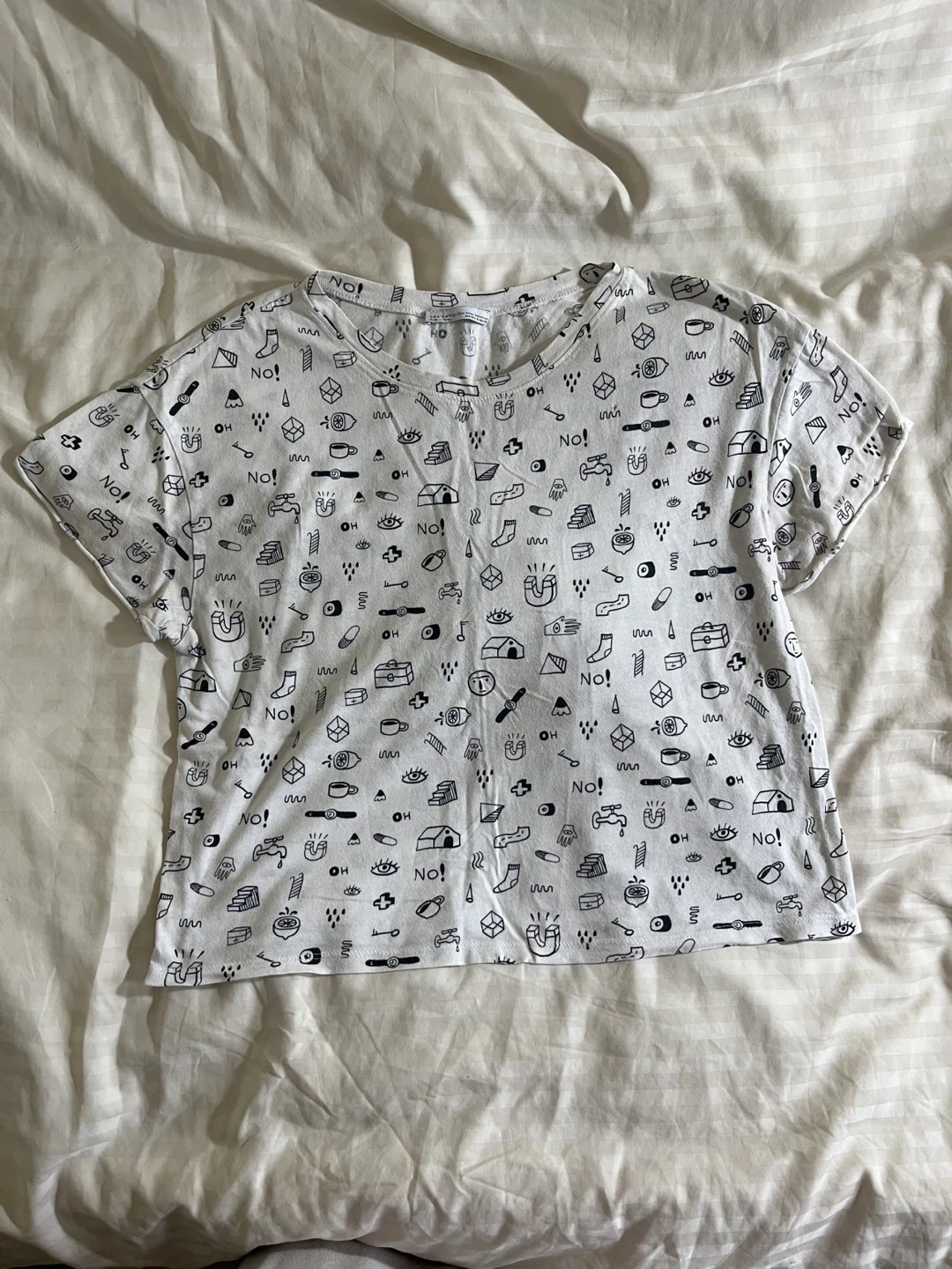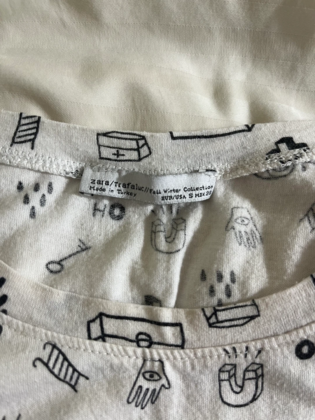 Cute Zara Trafaluc T-shirt with a unique all-over pattern! It's a size small and in good/okay condition. Perfect for casual wear! It’s thin and breezy which is also nice for summer or lounge wear.