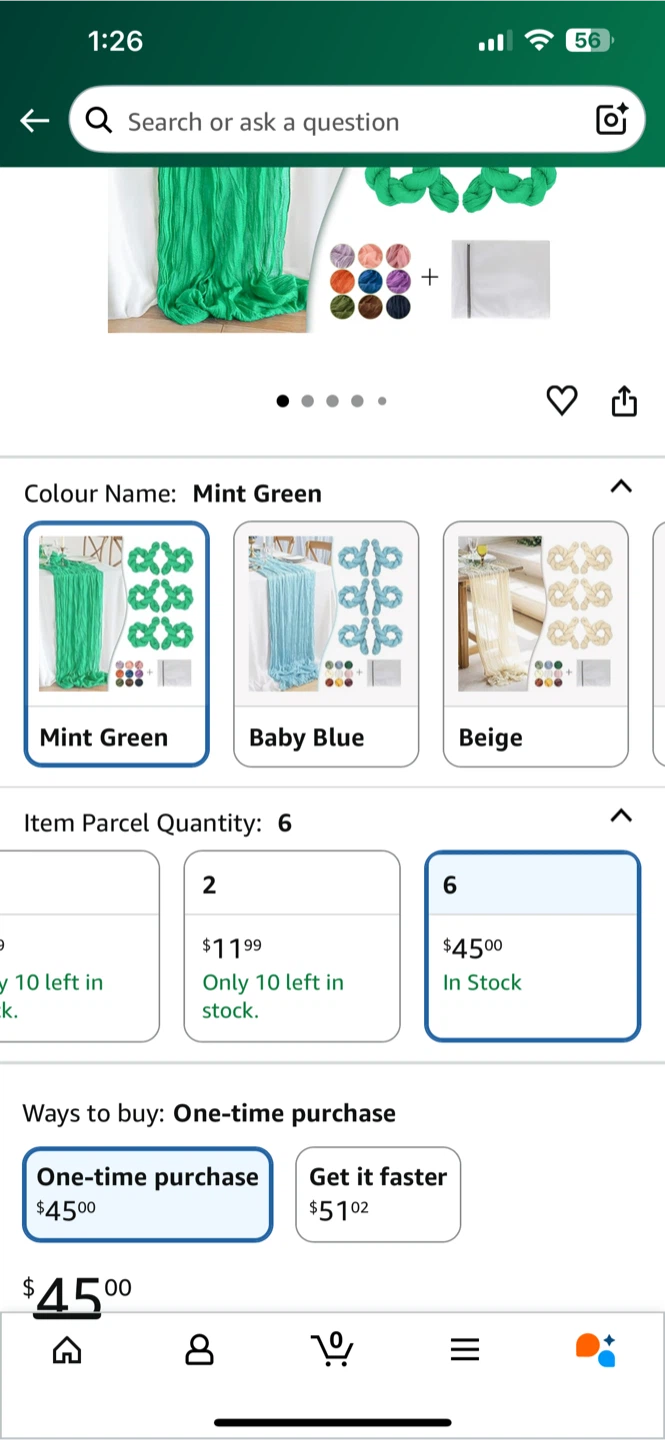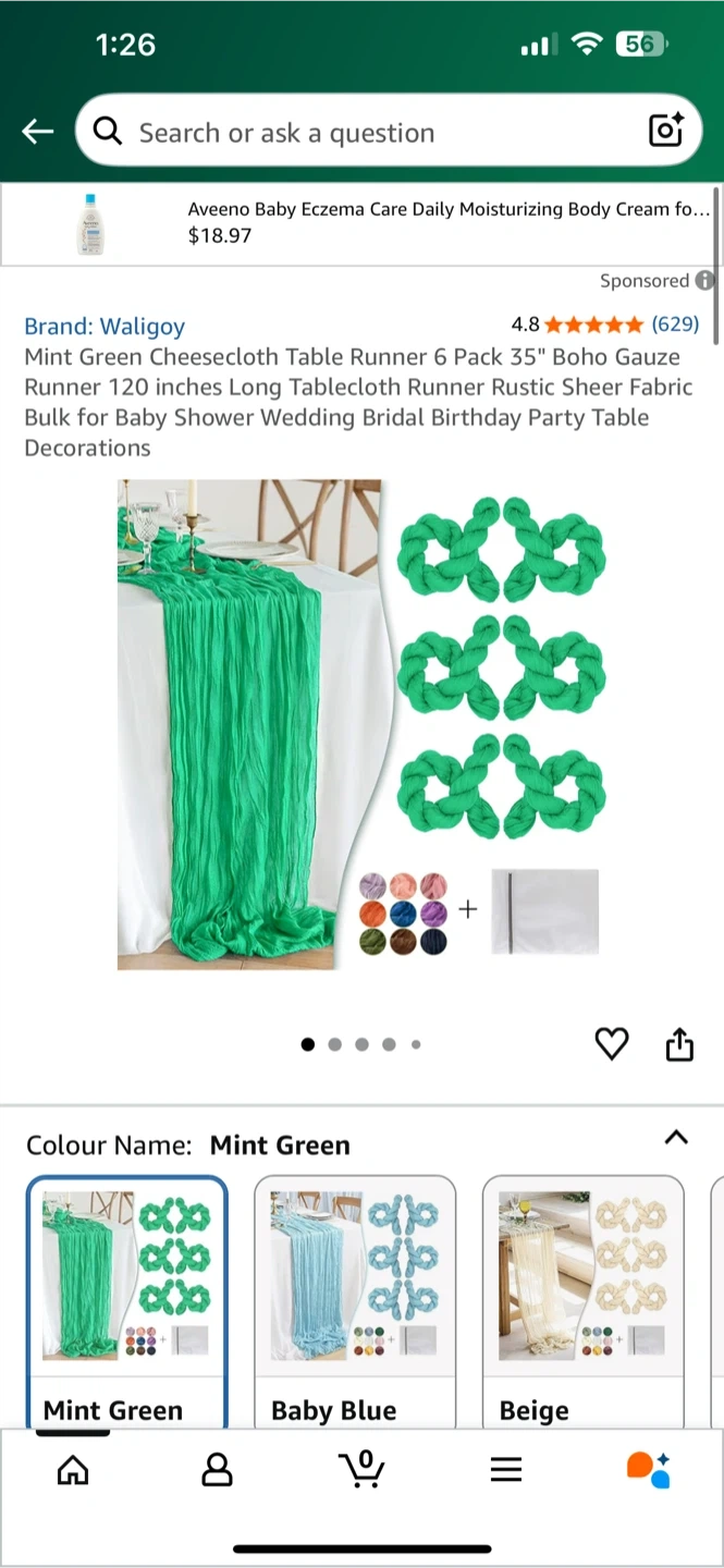 This is a brand new, still-in-packaging mint green cheesecloth table runner. It measures 120 inches by 35 inches, perfect for adding a touch of elegance to your table setting. Accessories contain one laundry bag and six packs of decor.