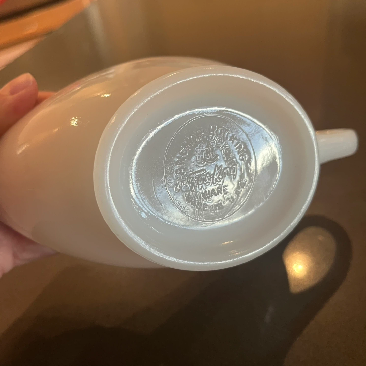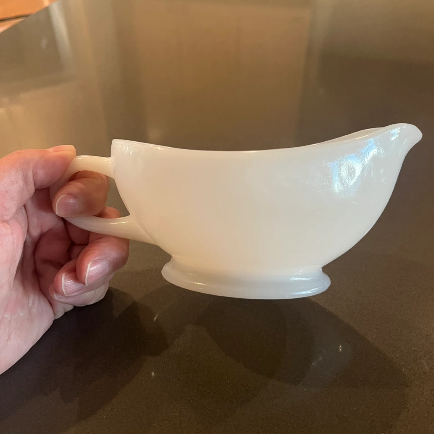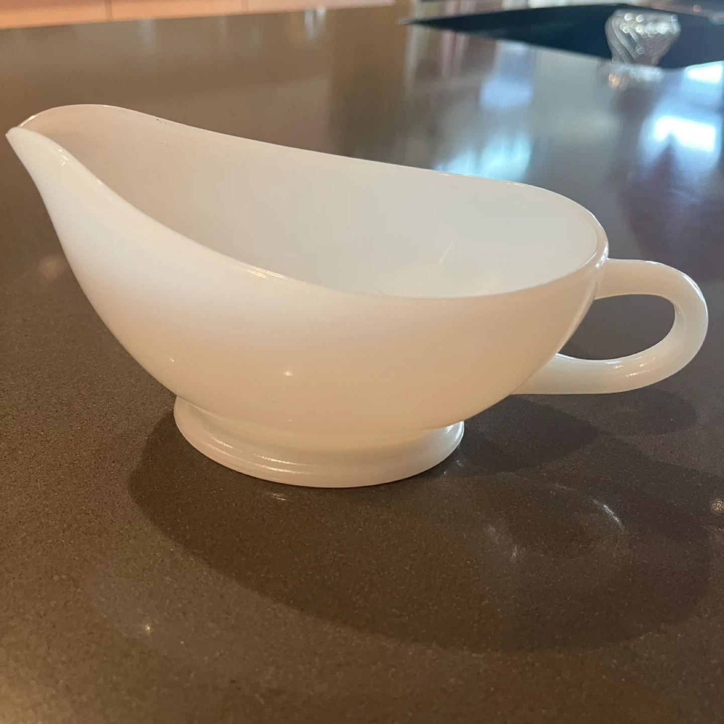 Classic Fire King gravy boat, crafted from durable milk glass. This piece is in good condition, showing slight signs of use, which only adds to its authentic retro appeal.