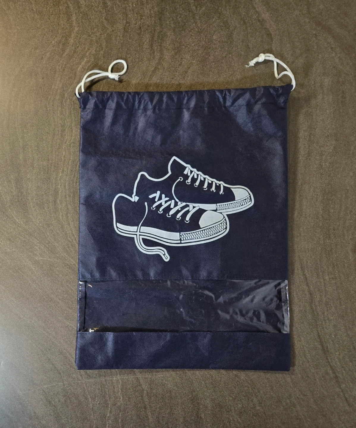 Like new. 13" wide and 17" tall. Drawstring bag with clear window perfect for storing shoes or other small items. Great for travel. Blue colour and features a simple shoe design on the front. Cross-posted.