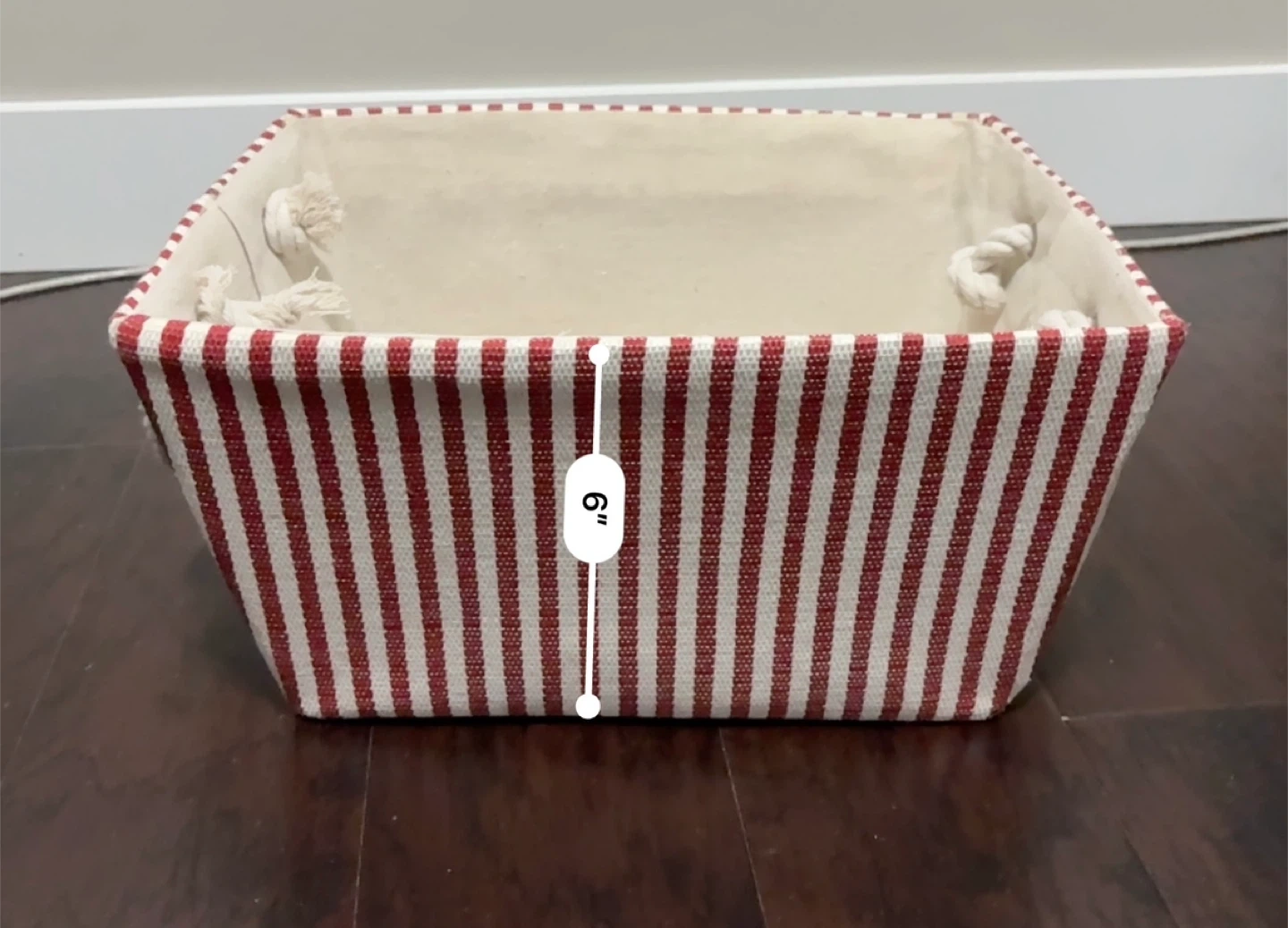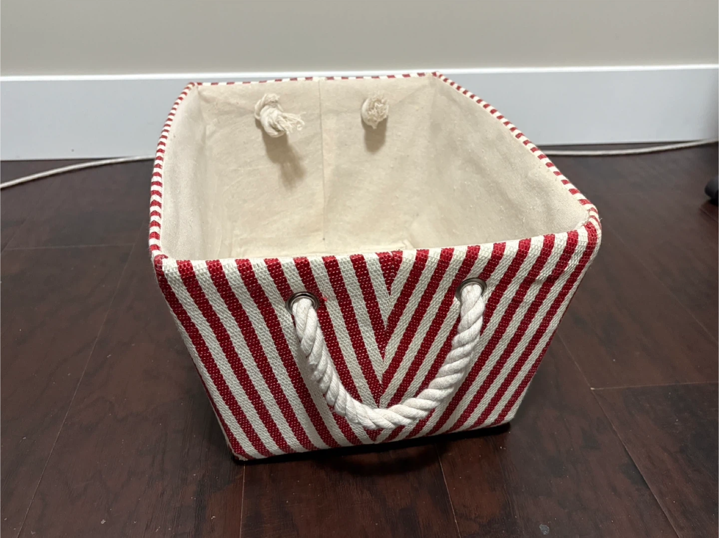Here's a cute striped fabric storage basket! It's in great shape and ready to help organize your space.