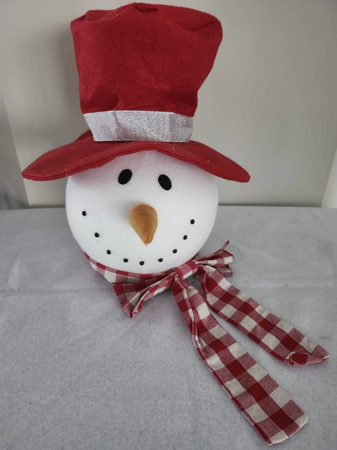 Here's a cute snowman head decoration! It has a red hat with a silver band and a red and white checkered bow.